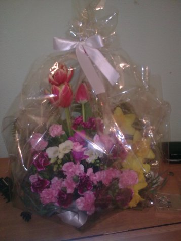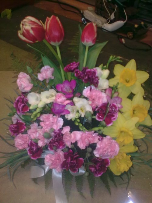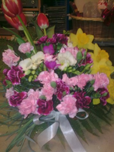 Aranjament de primavara din lalele, garofite, frezii si narcise.  Pret: in functie de nr. de flori folosite.