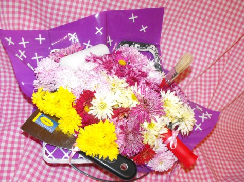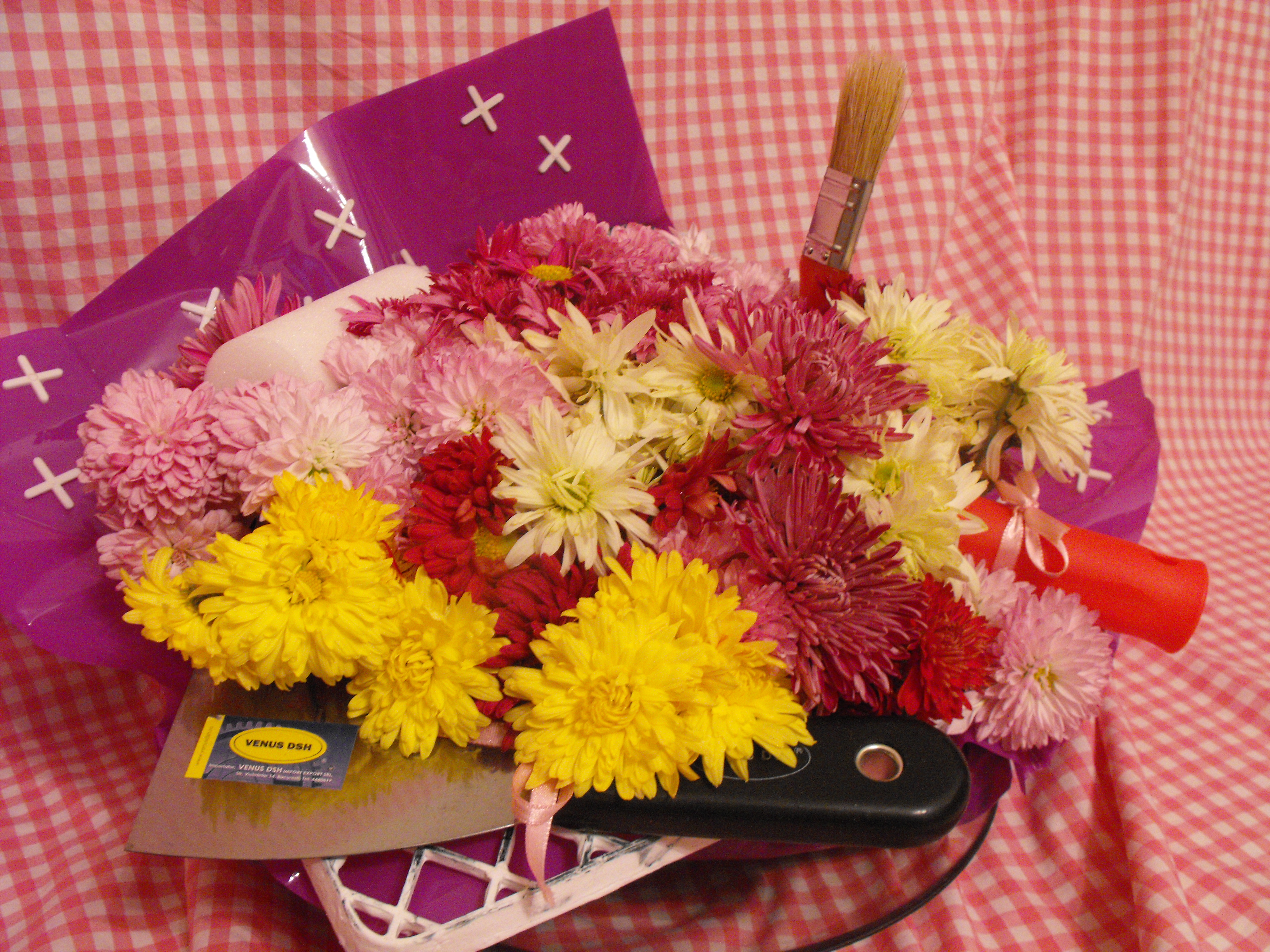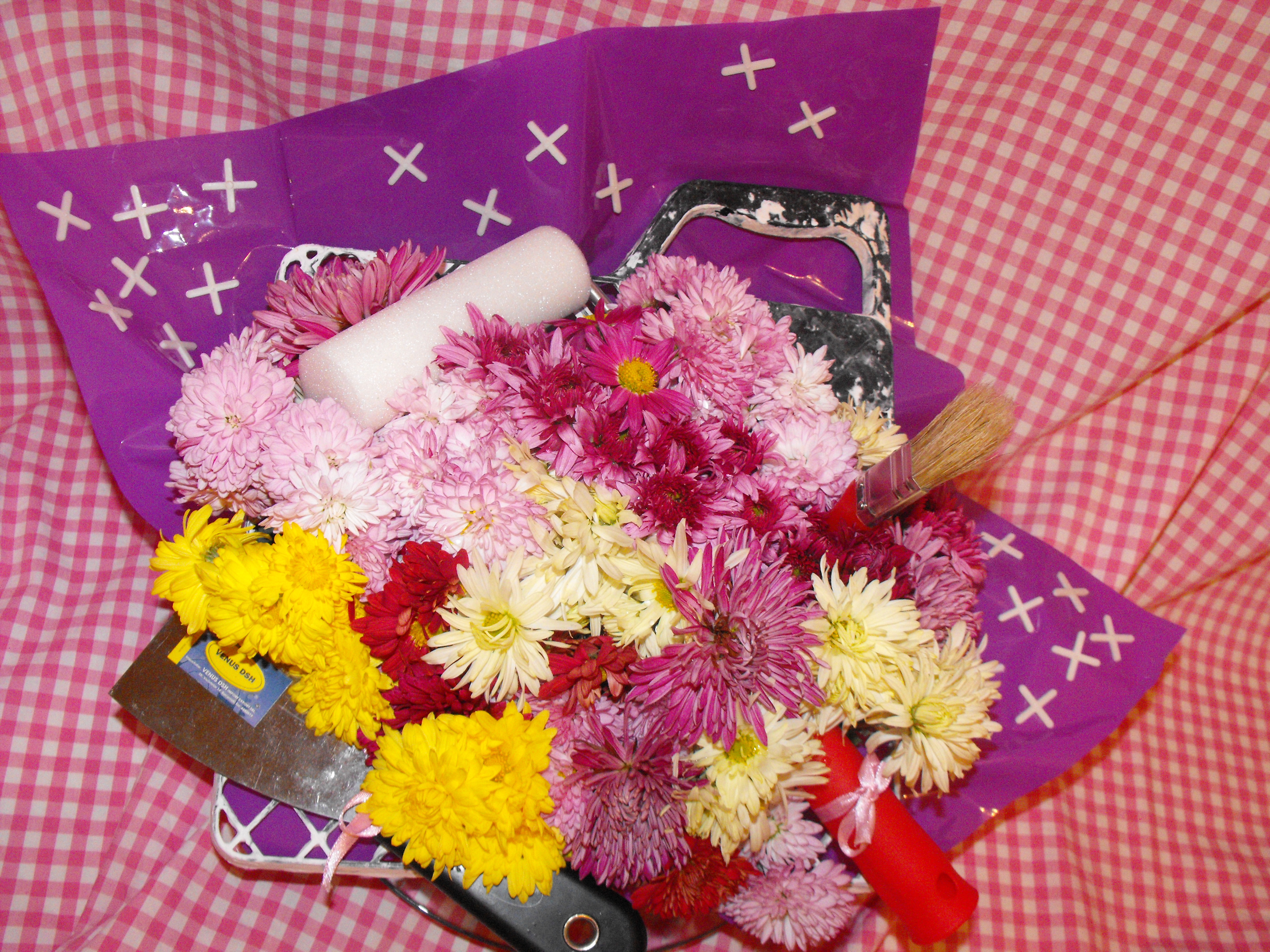 Da, aranjamentul contine pe langa flori… un spaclu, un trafalet, o pensula si o grila pentru vopsea. 🙂
