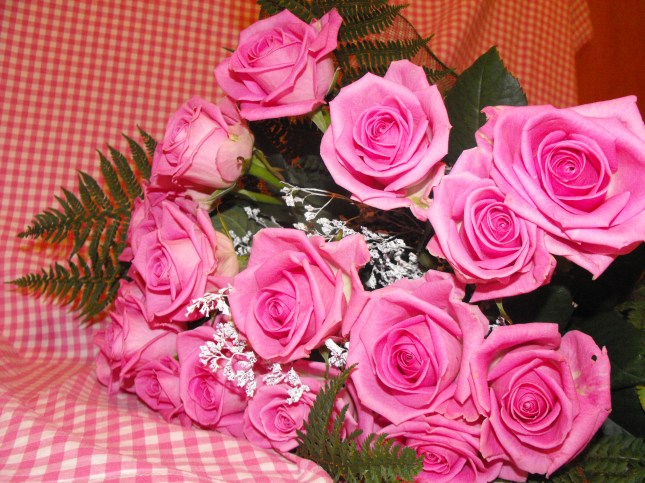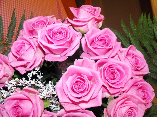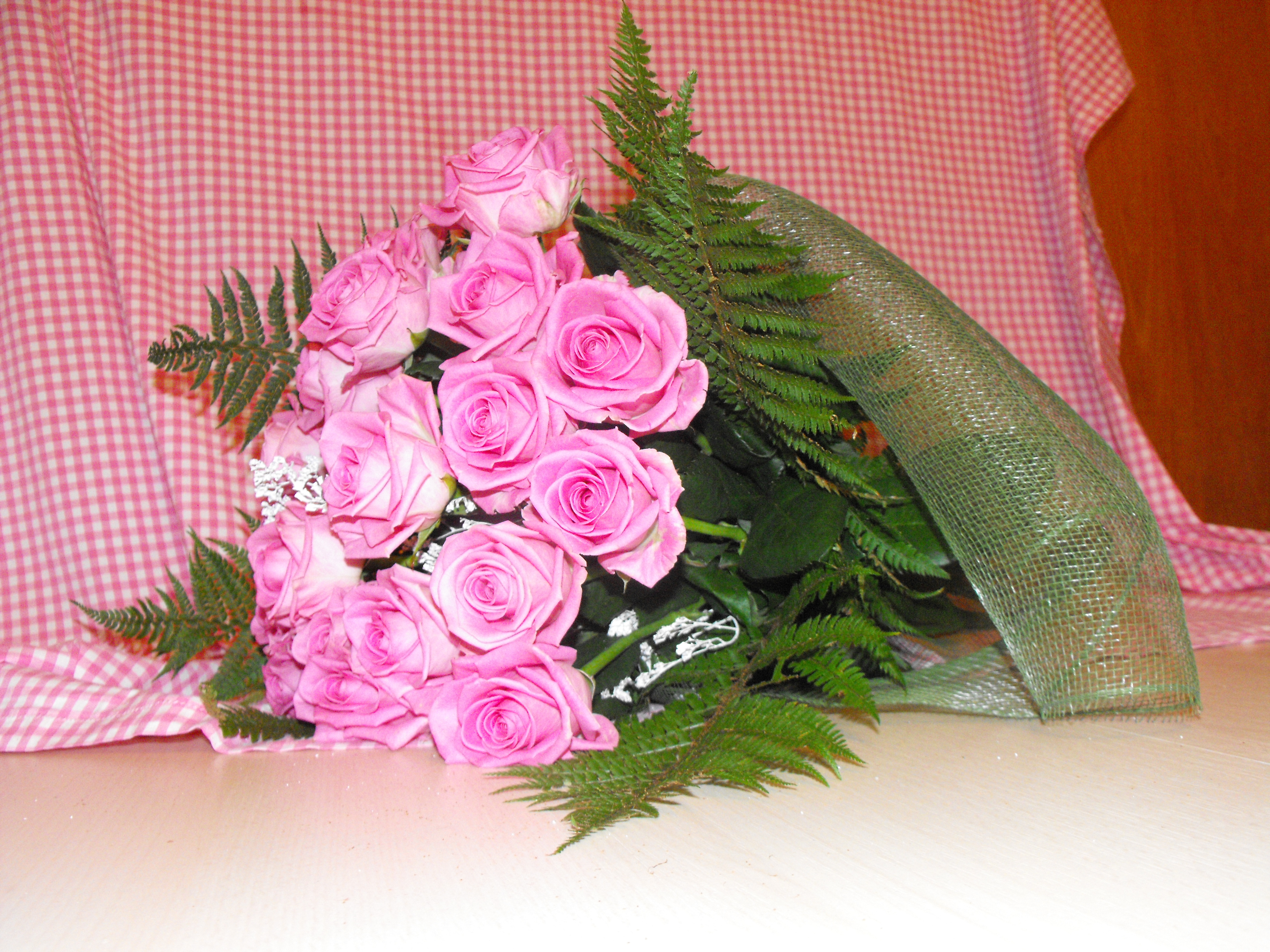 Buchet de 19 trandafiri mari, roz-lila, cu decor plasa. Disponibil in orice culoare.