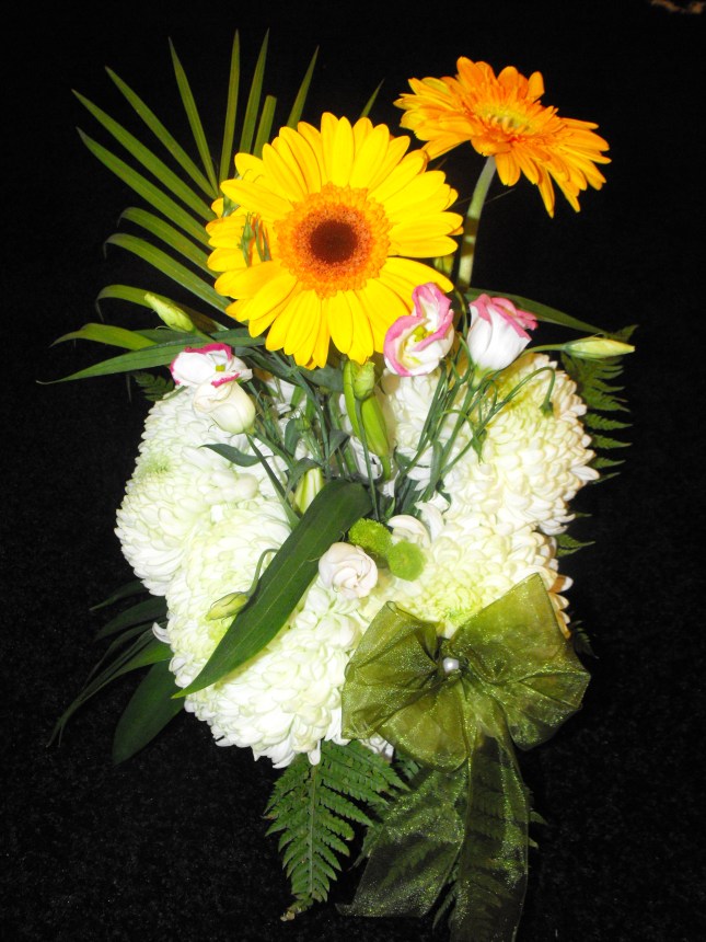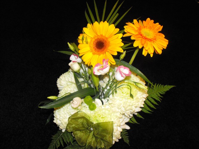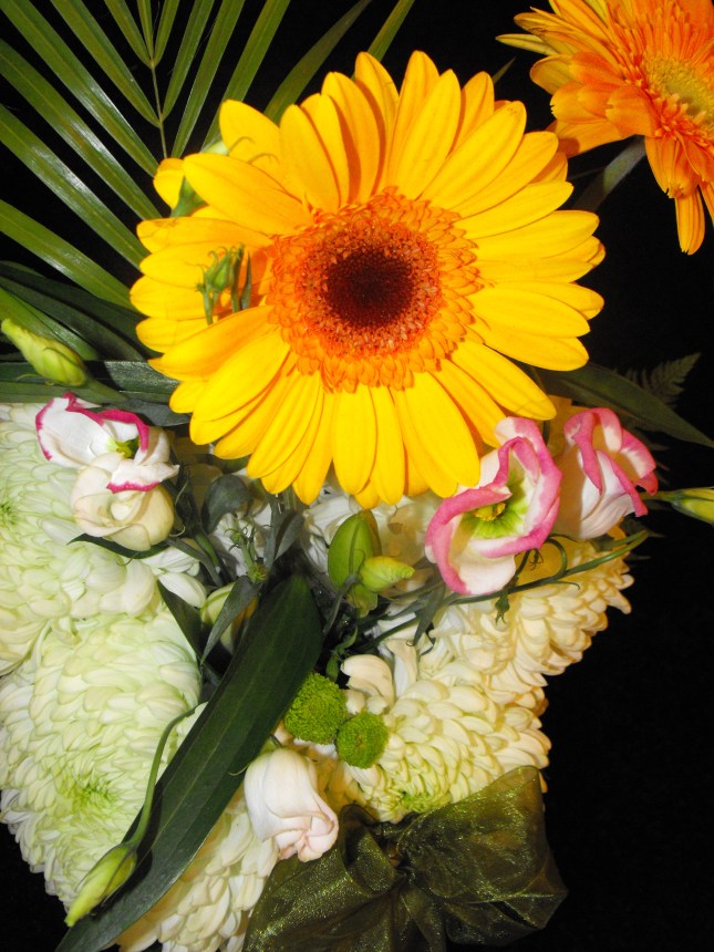 Aranjament cu crizanteme, gerbera si lisyanthus,