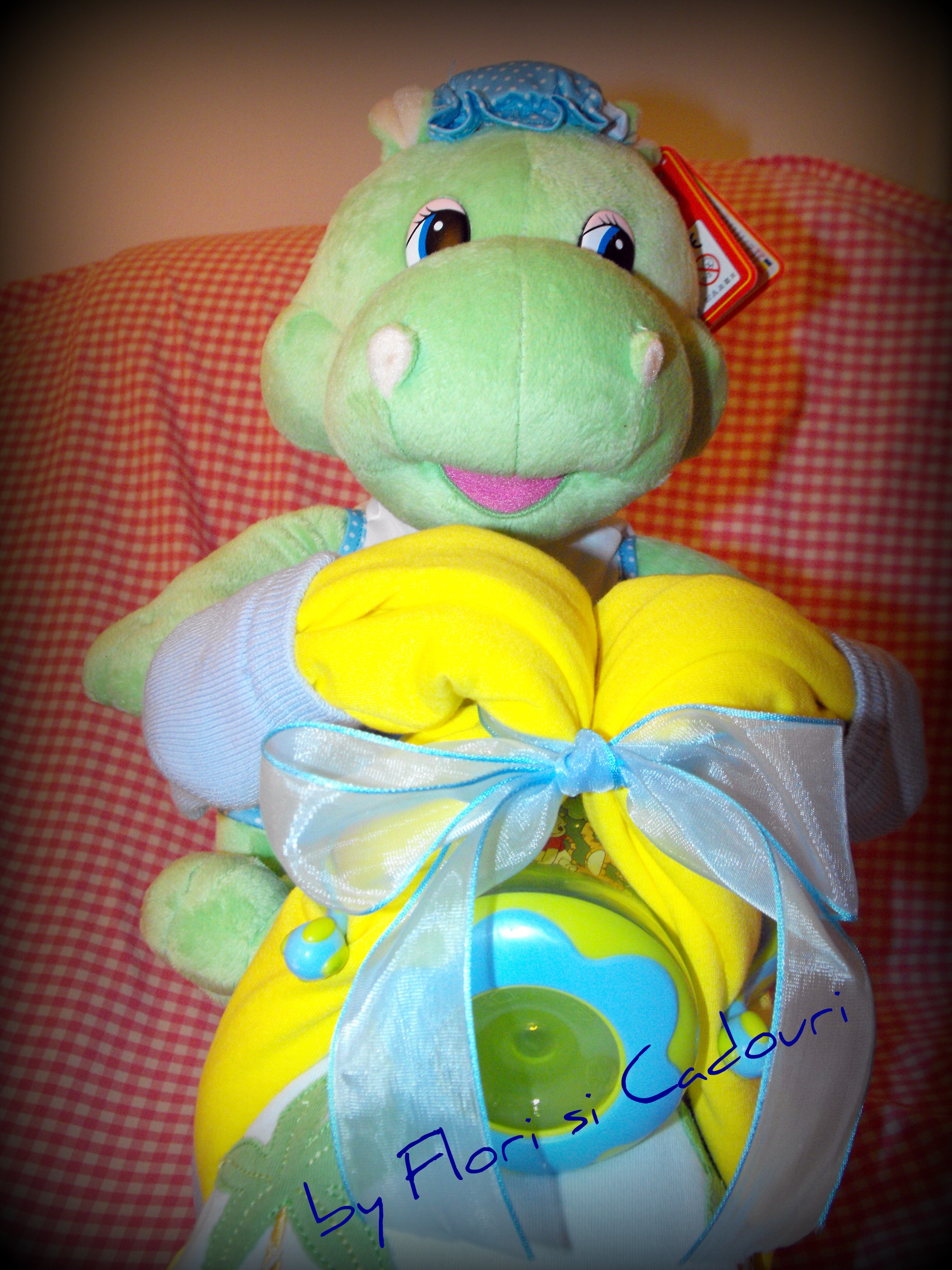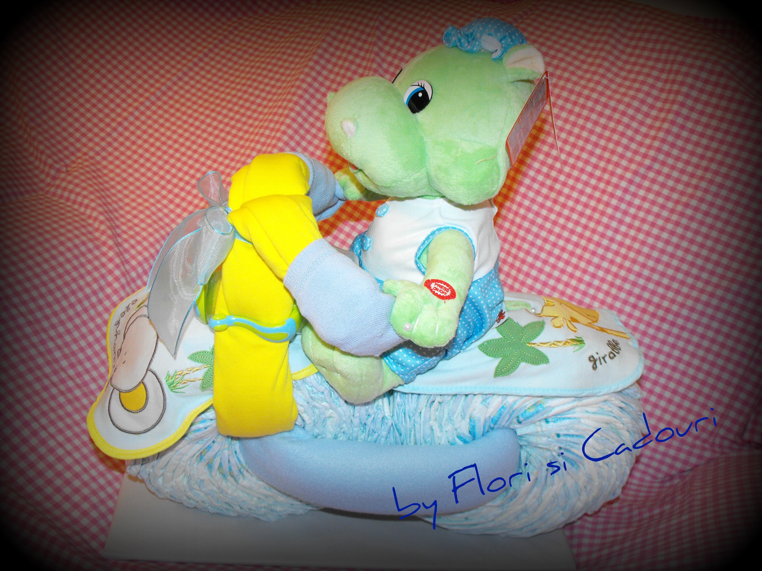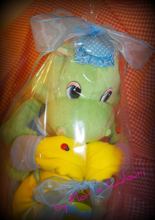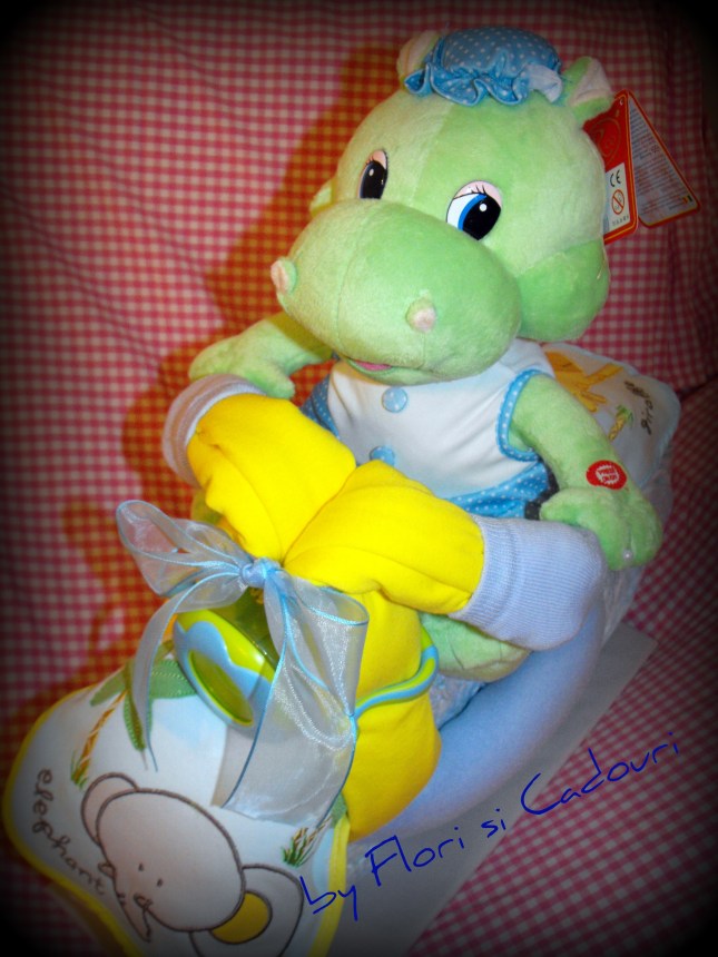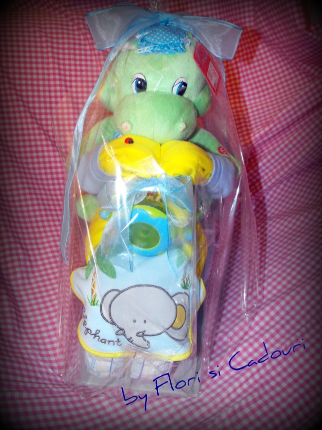 Ideal pentru botez sau pentru aniversarea bebelusului, contine obiecte ce pot fi folosite – scutece, paturici, bavetele, sosetele, un biberon si o jucarie de plus.