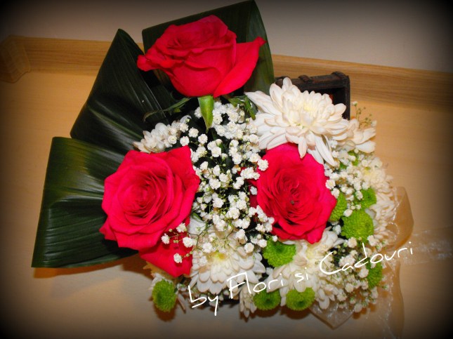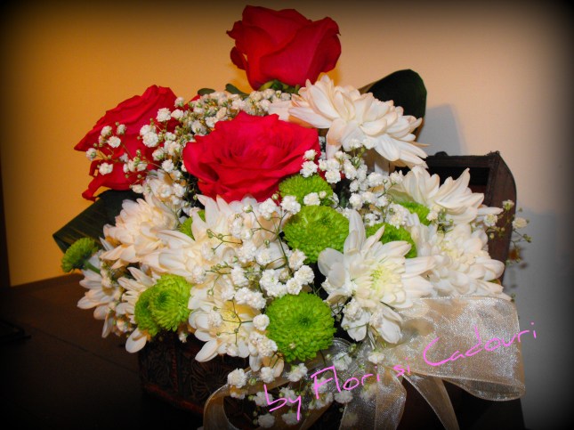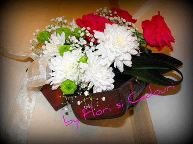 Cufar cu trandafiri, crizanteme si floarea miresei.