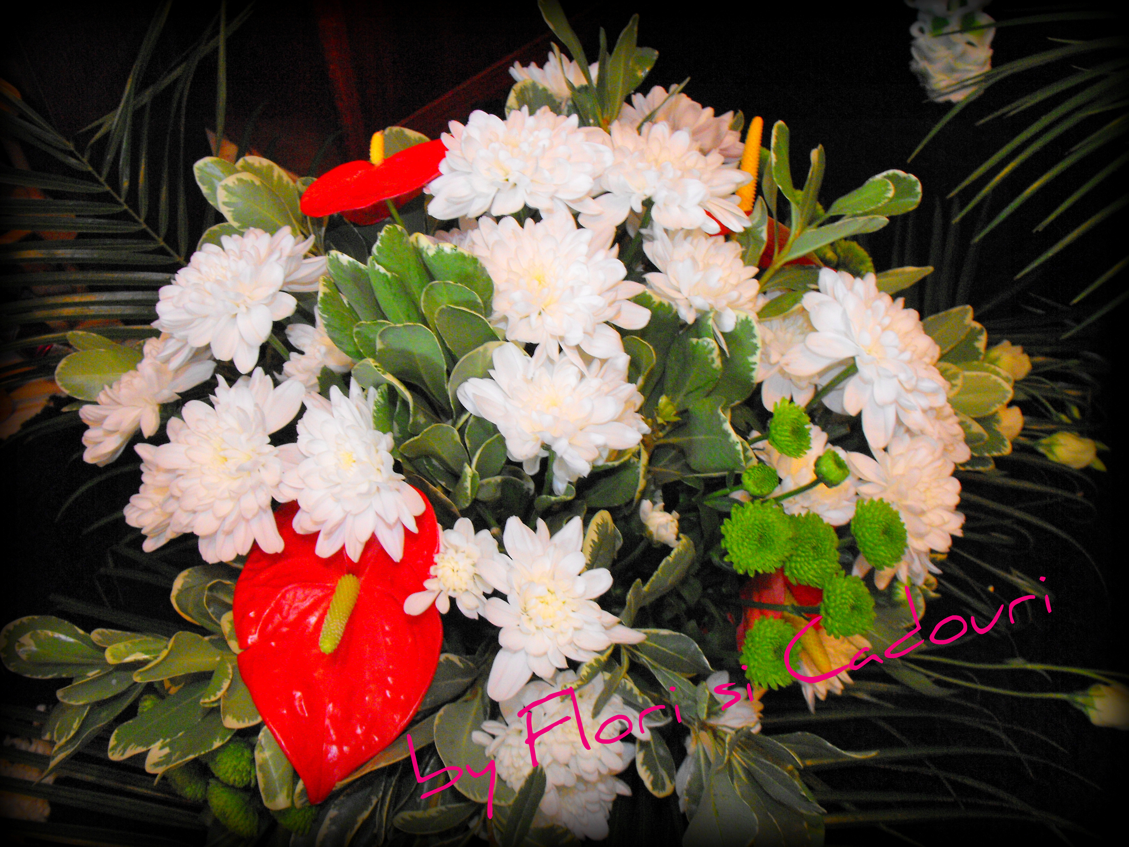 cu crizantema albe si anthurium rosu