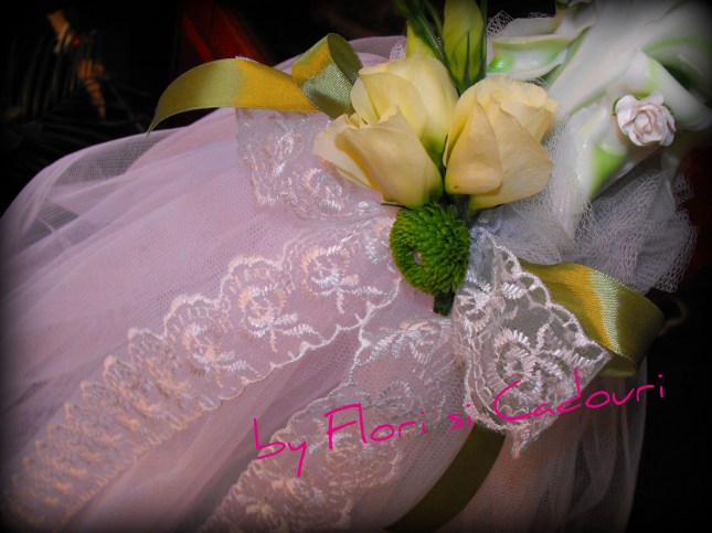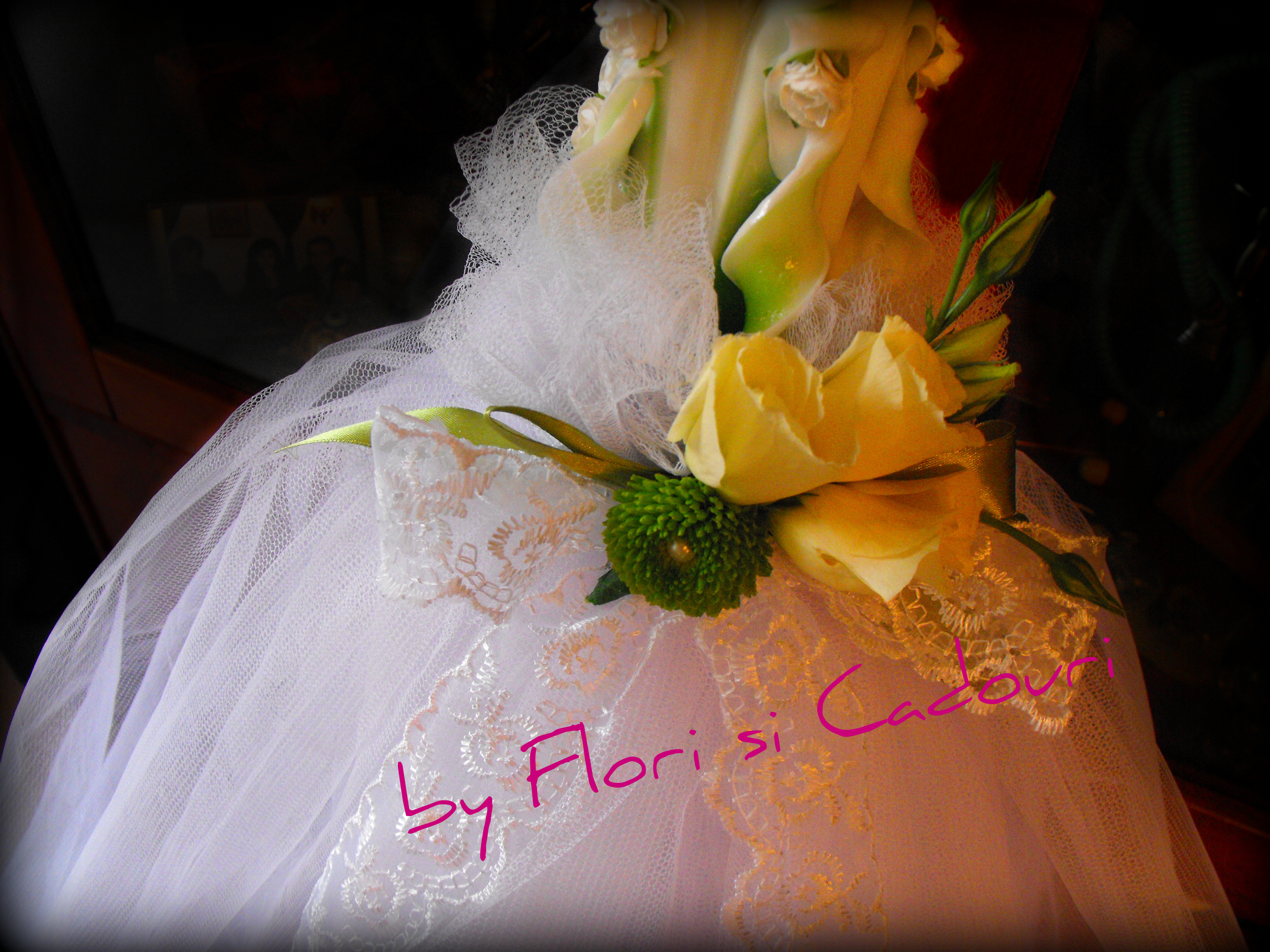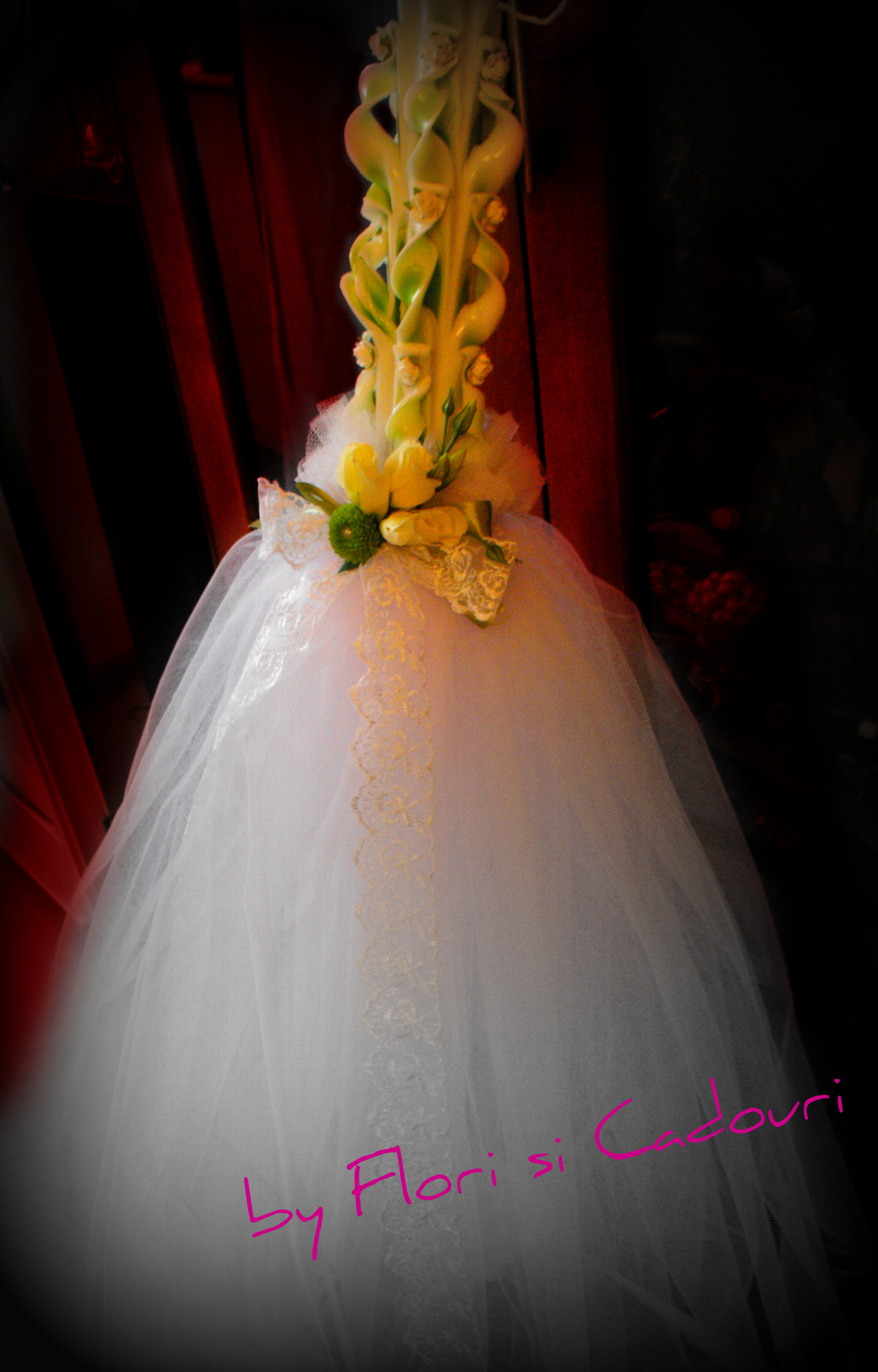 Lumanare de nunta sculptata decorata cu tulle, dantela si flori