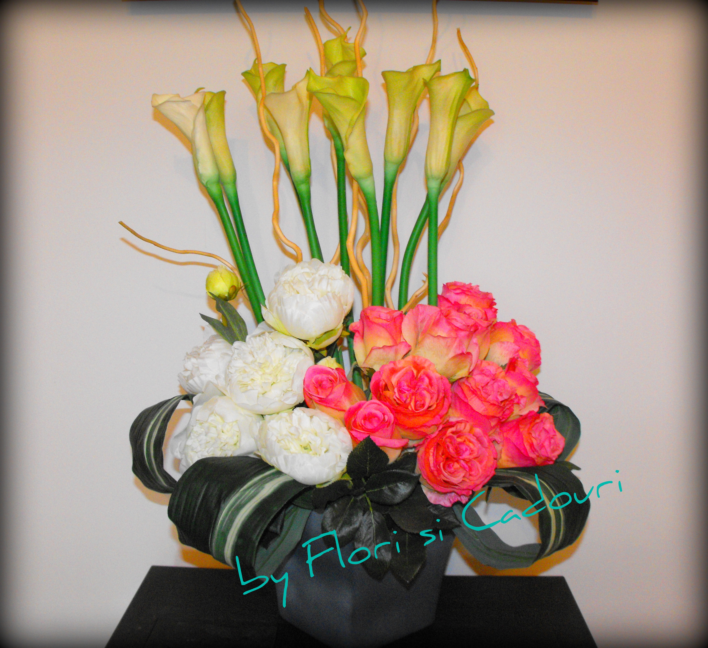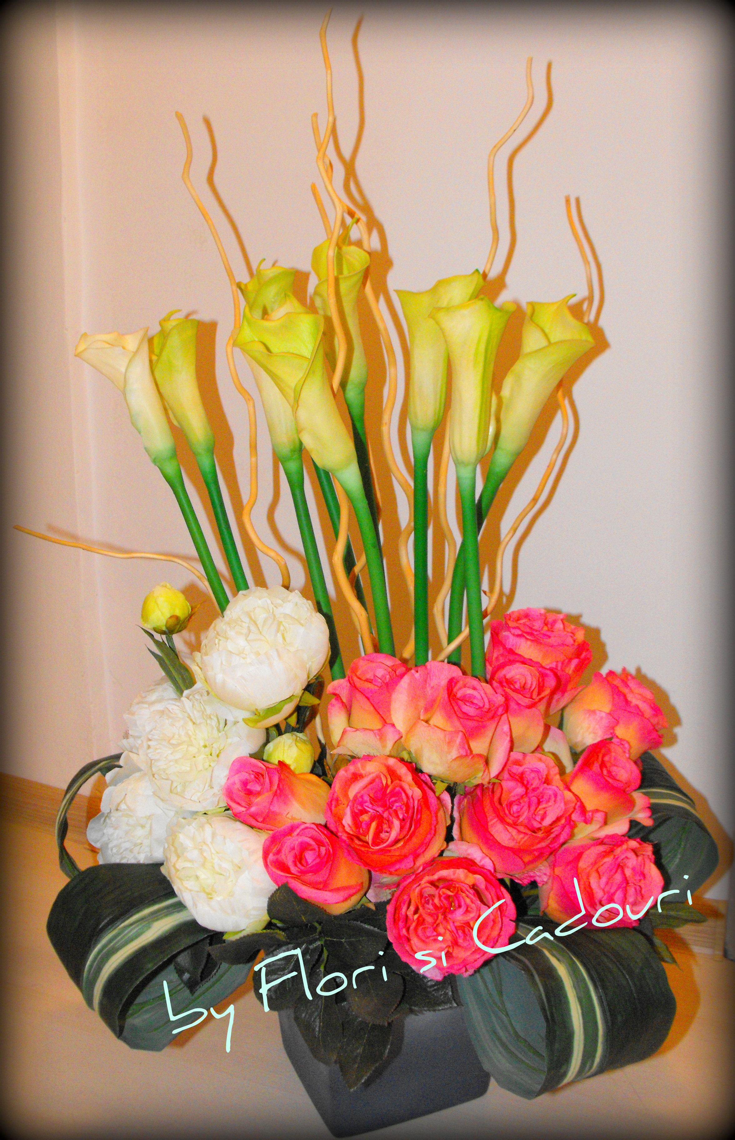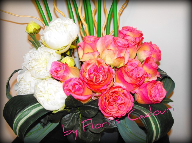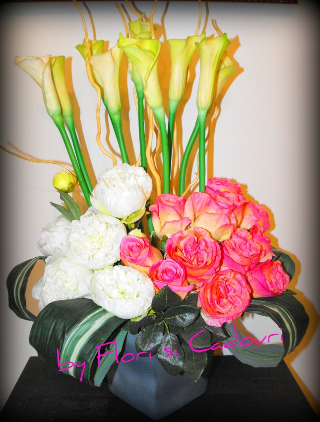 Aranjament din cale, trandafiri si crini artificiali