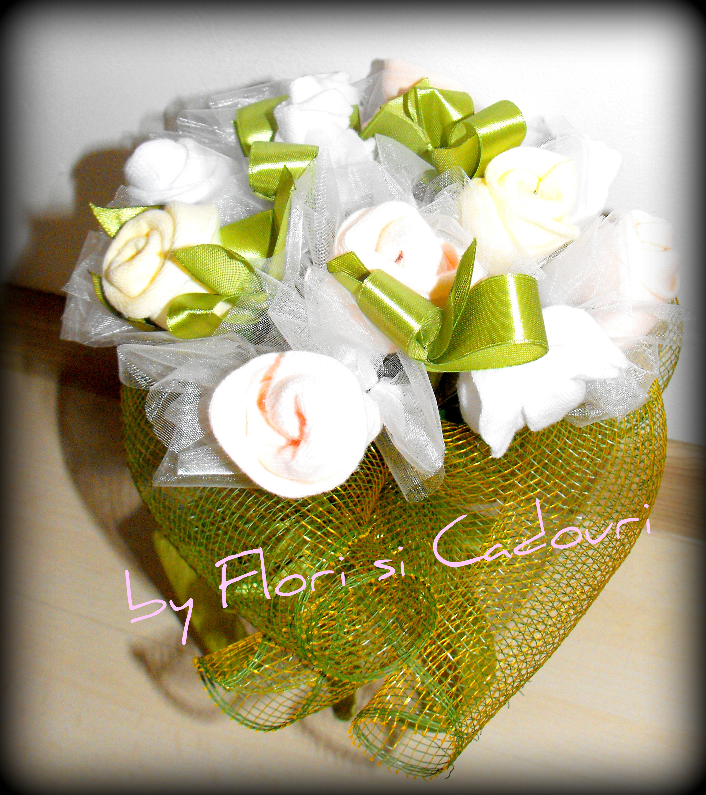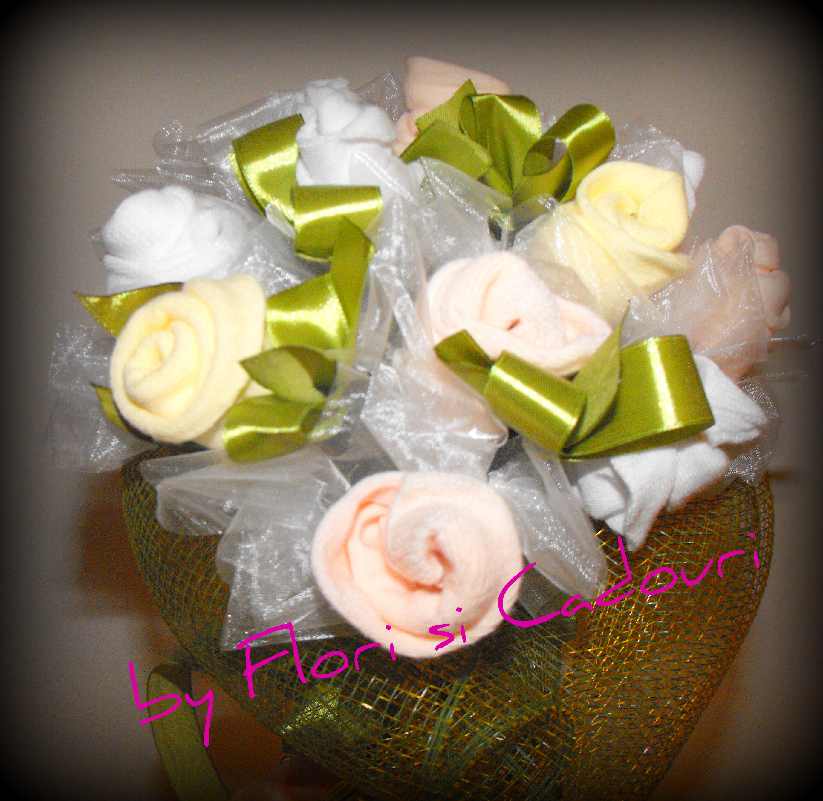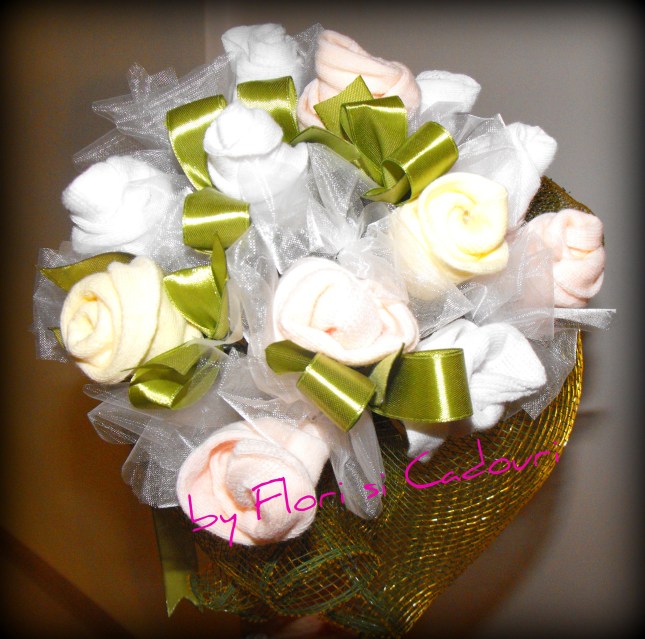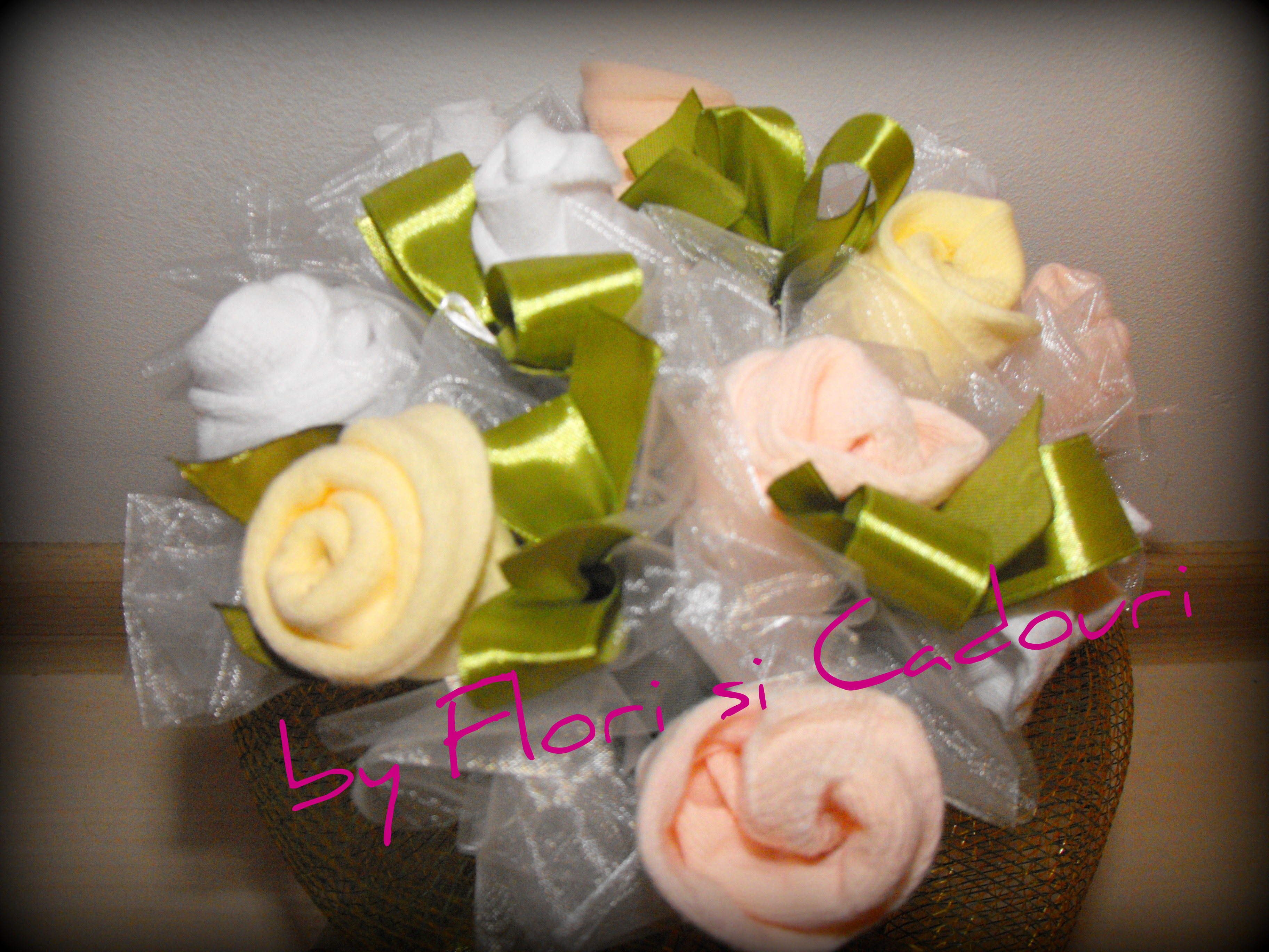 Buchet din flori facute din sosetele decorat cu panglici din organza