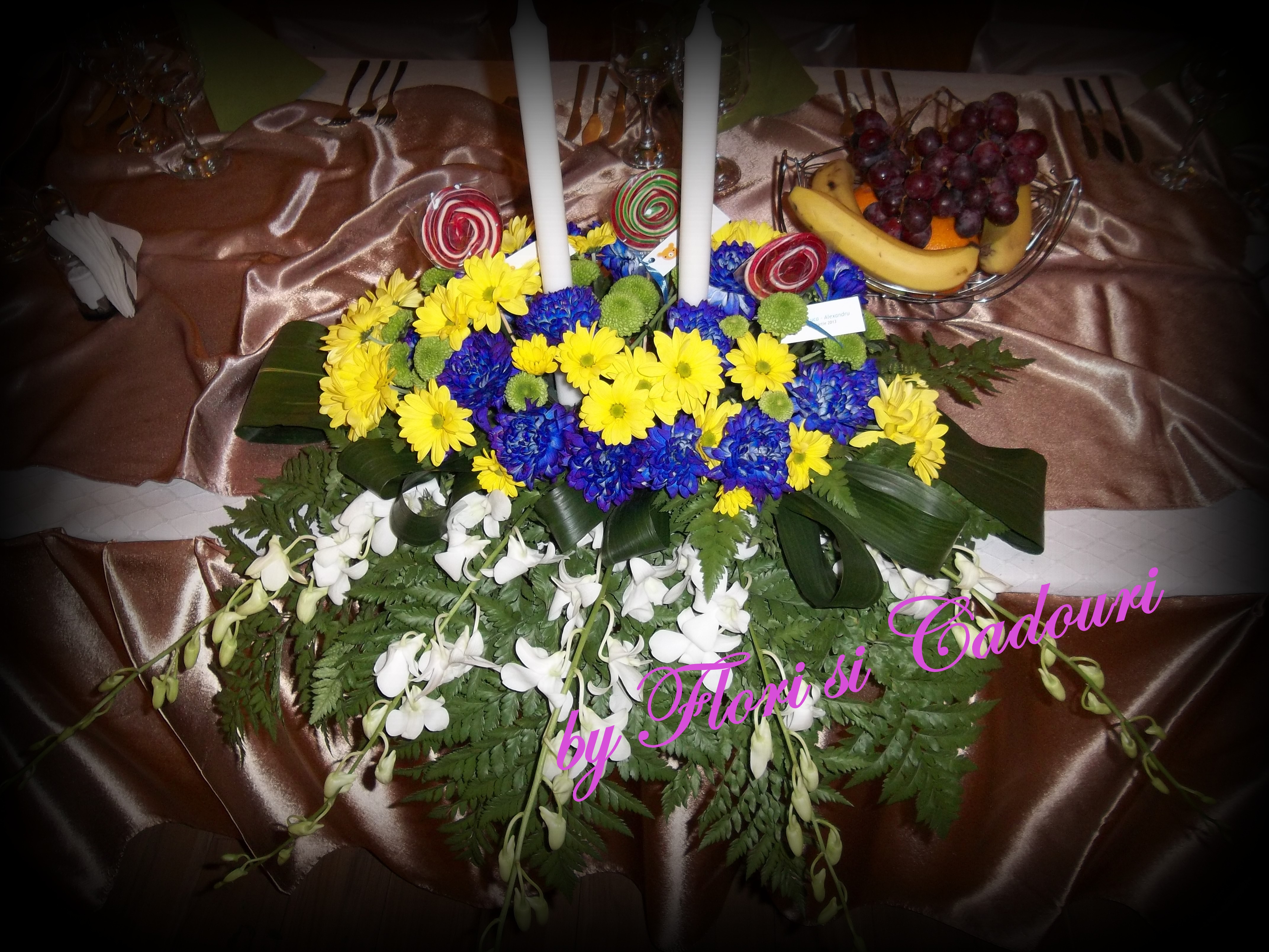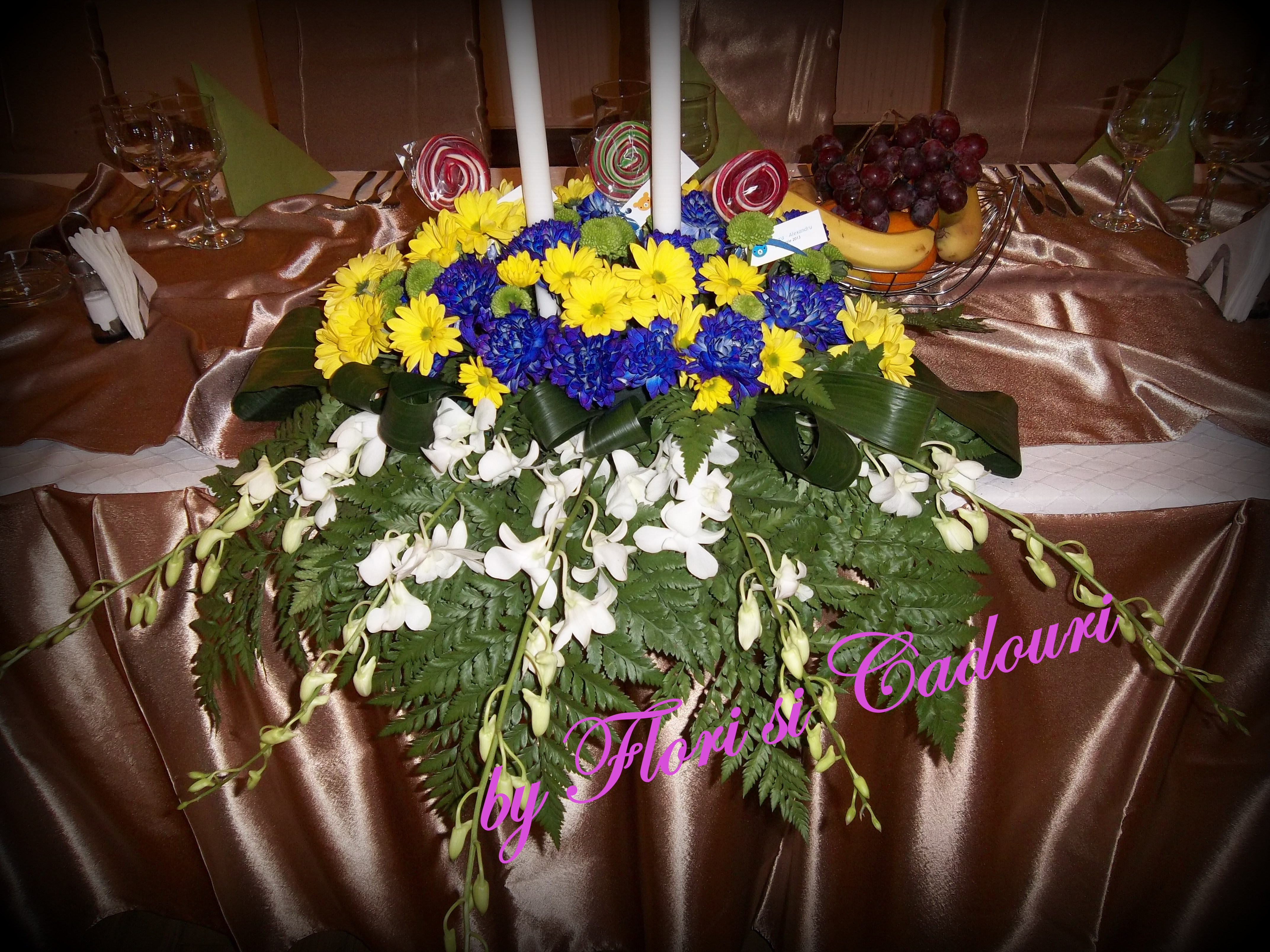 din crizanteme galbene, albastre si orhidee alba, decorate cu lumanari si acadele colorate
