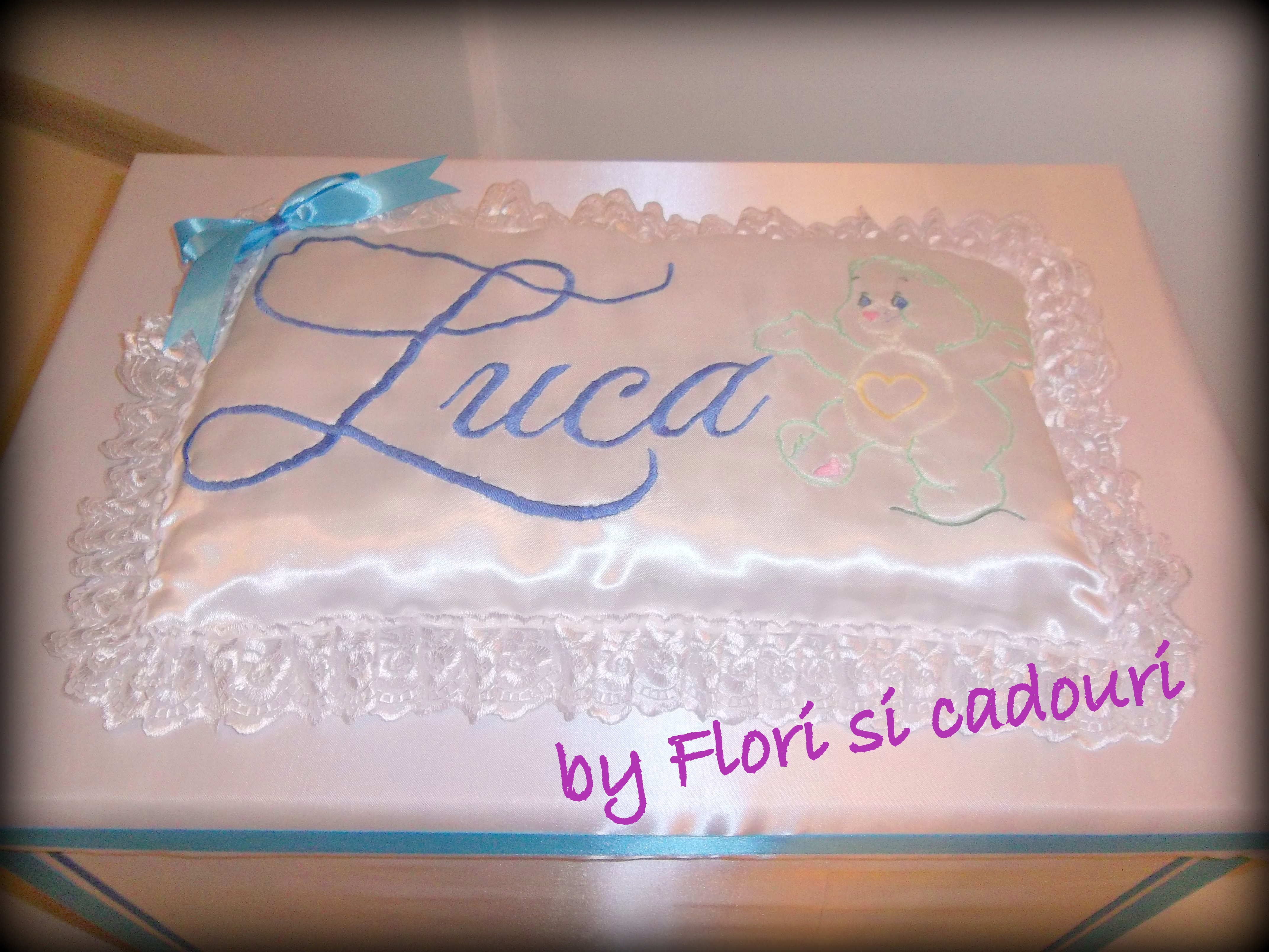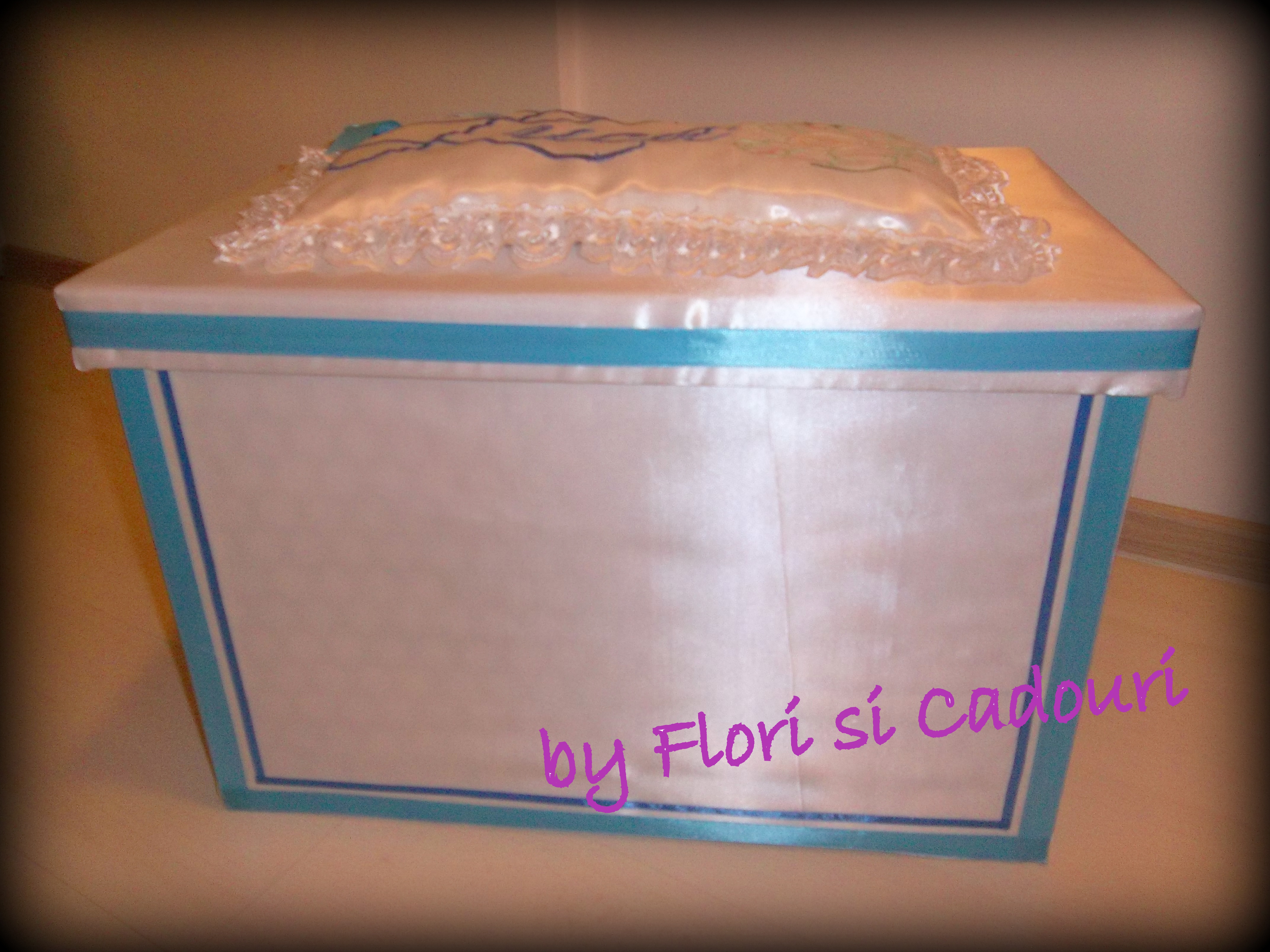 Cutia este imbracata in satin. Pernita brodata se poate detasa de cutie si poate fi folosita ca atare.