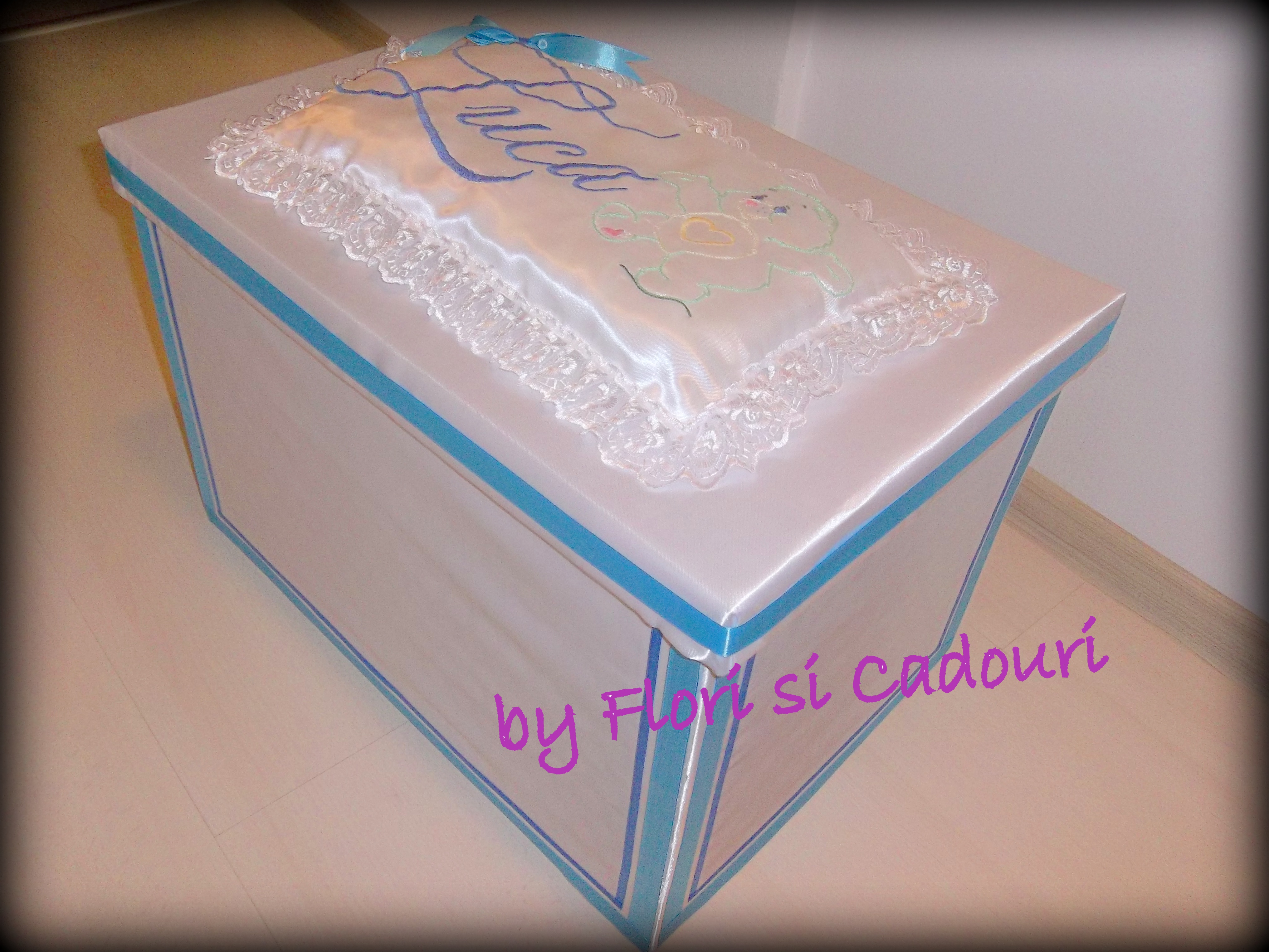 Cutie personalizata cu o broderie realizata manual cu numele bebelusului.