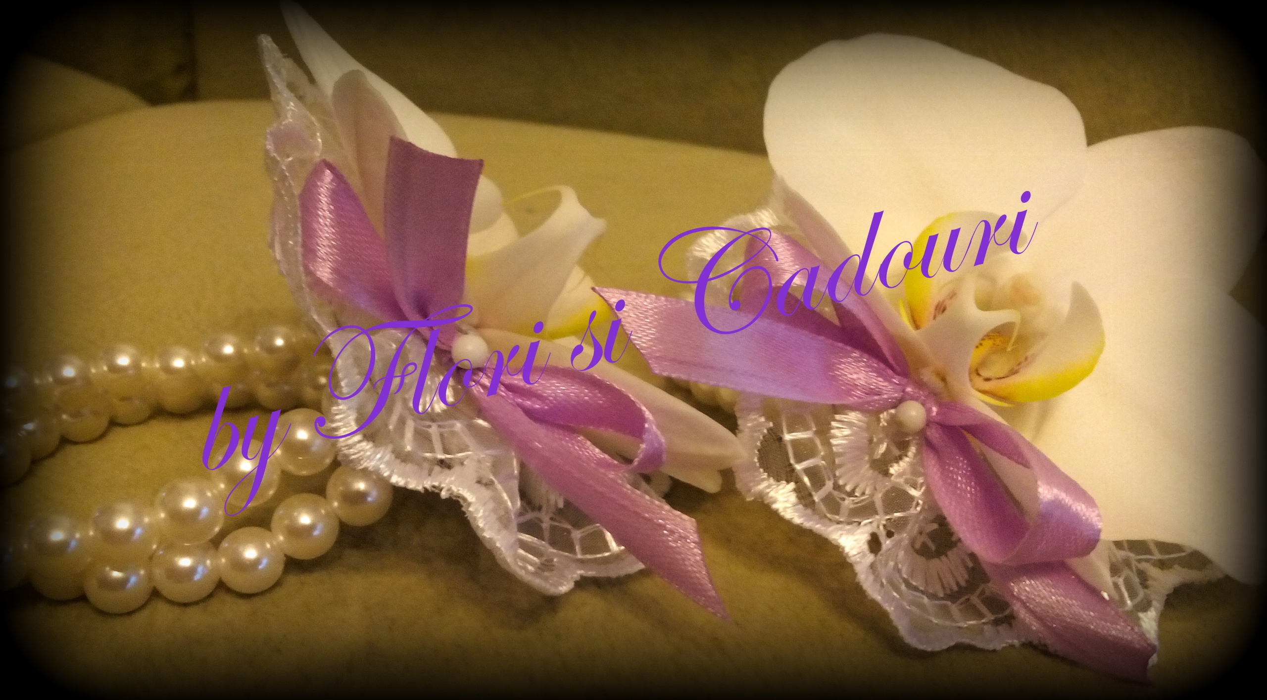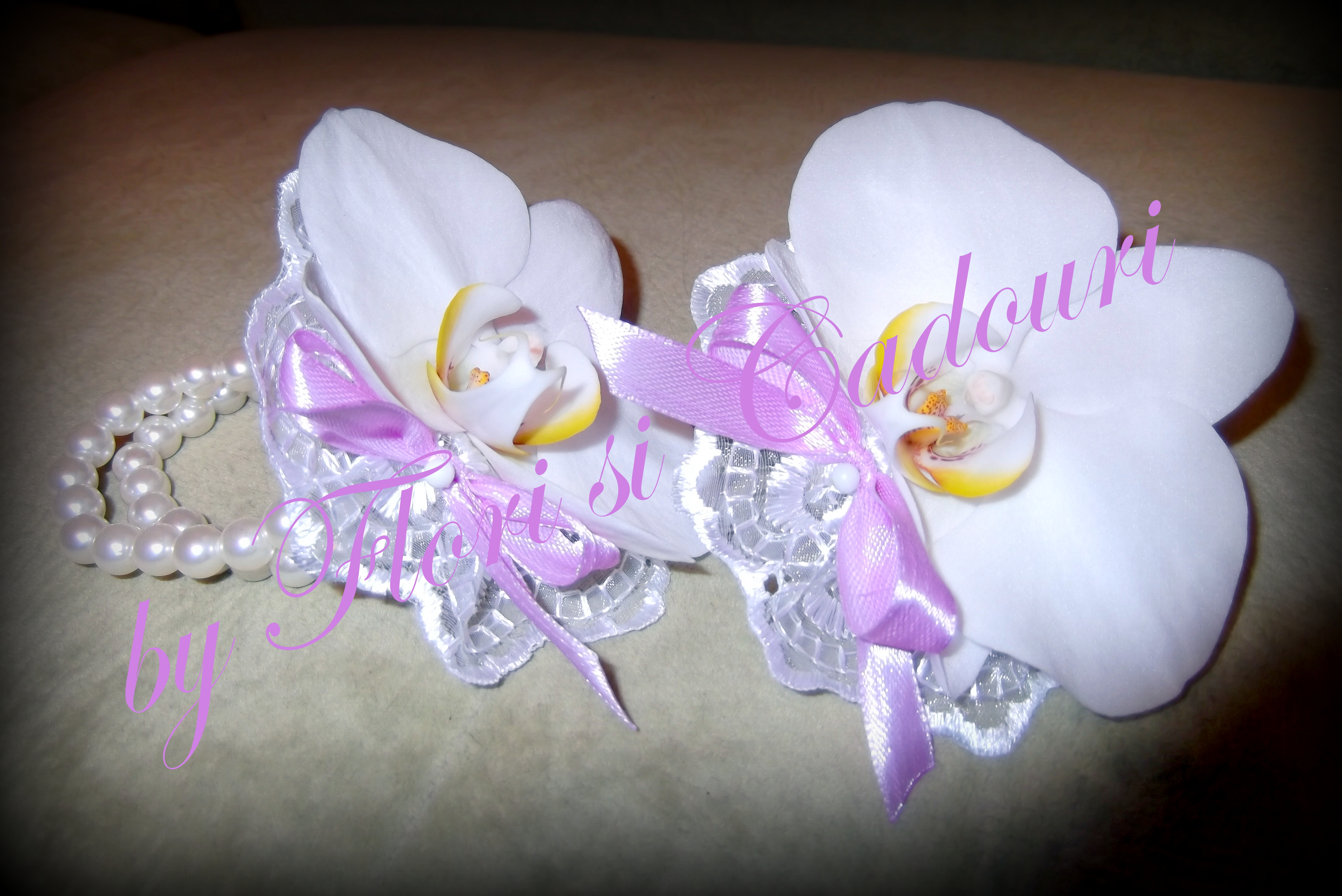 Bratarile pot fi personalizate schimband culoarea funditelor, a orhideelor si a perlutelor.