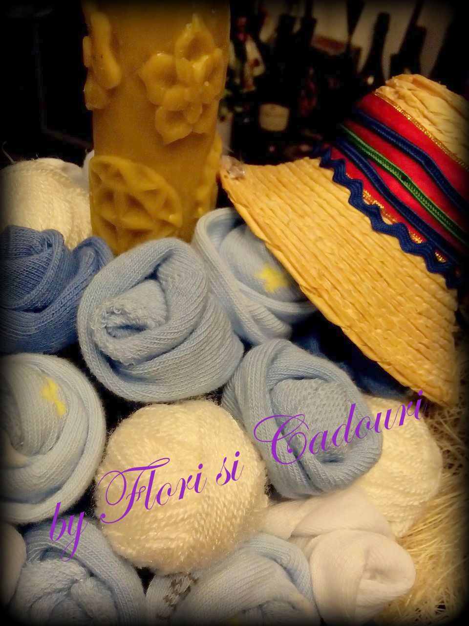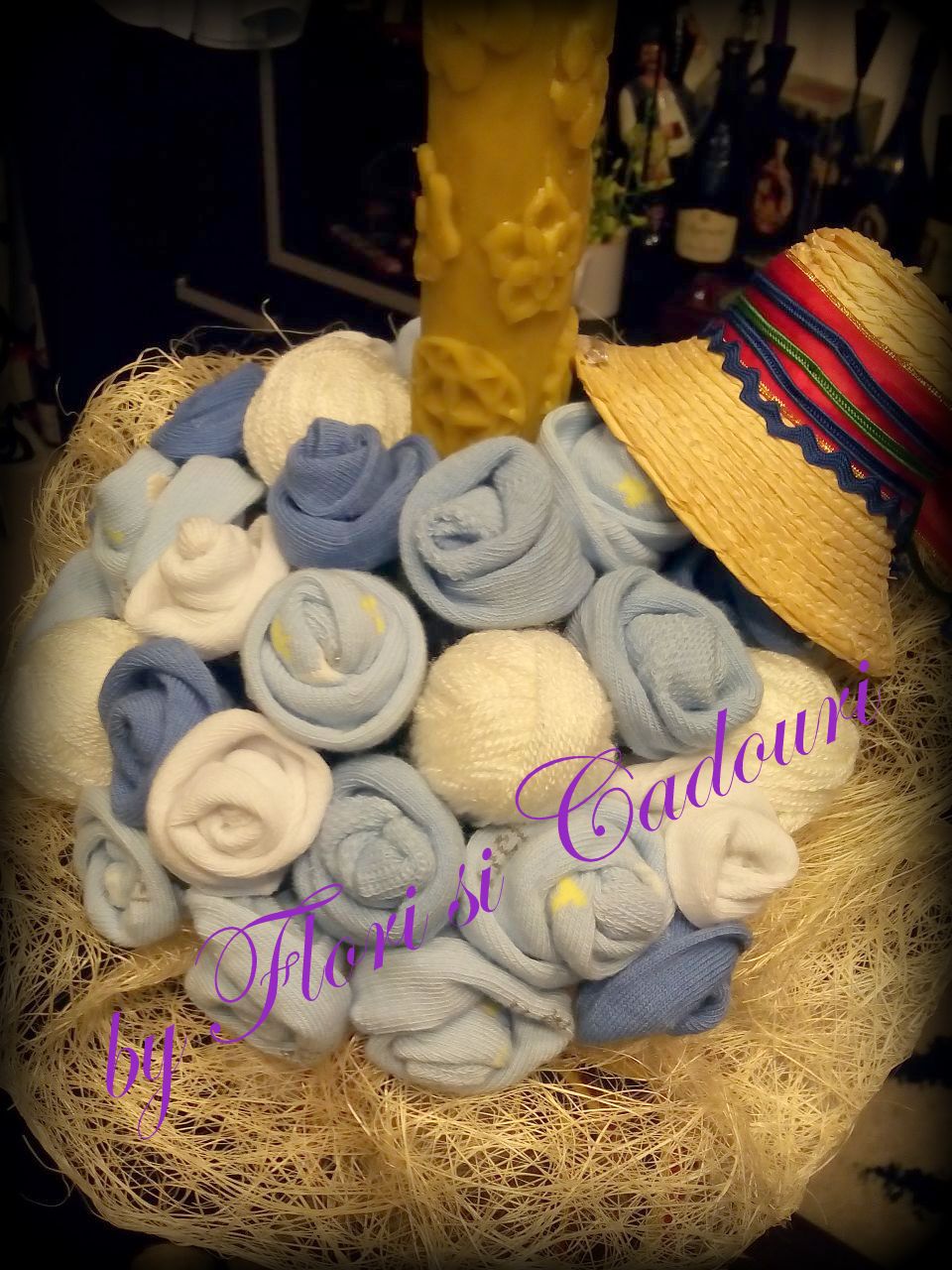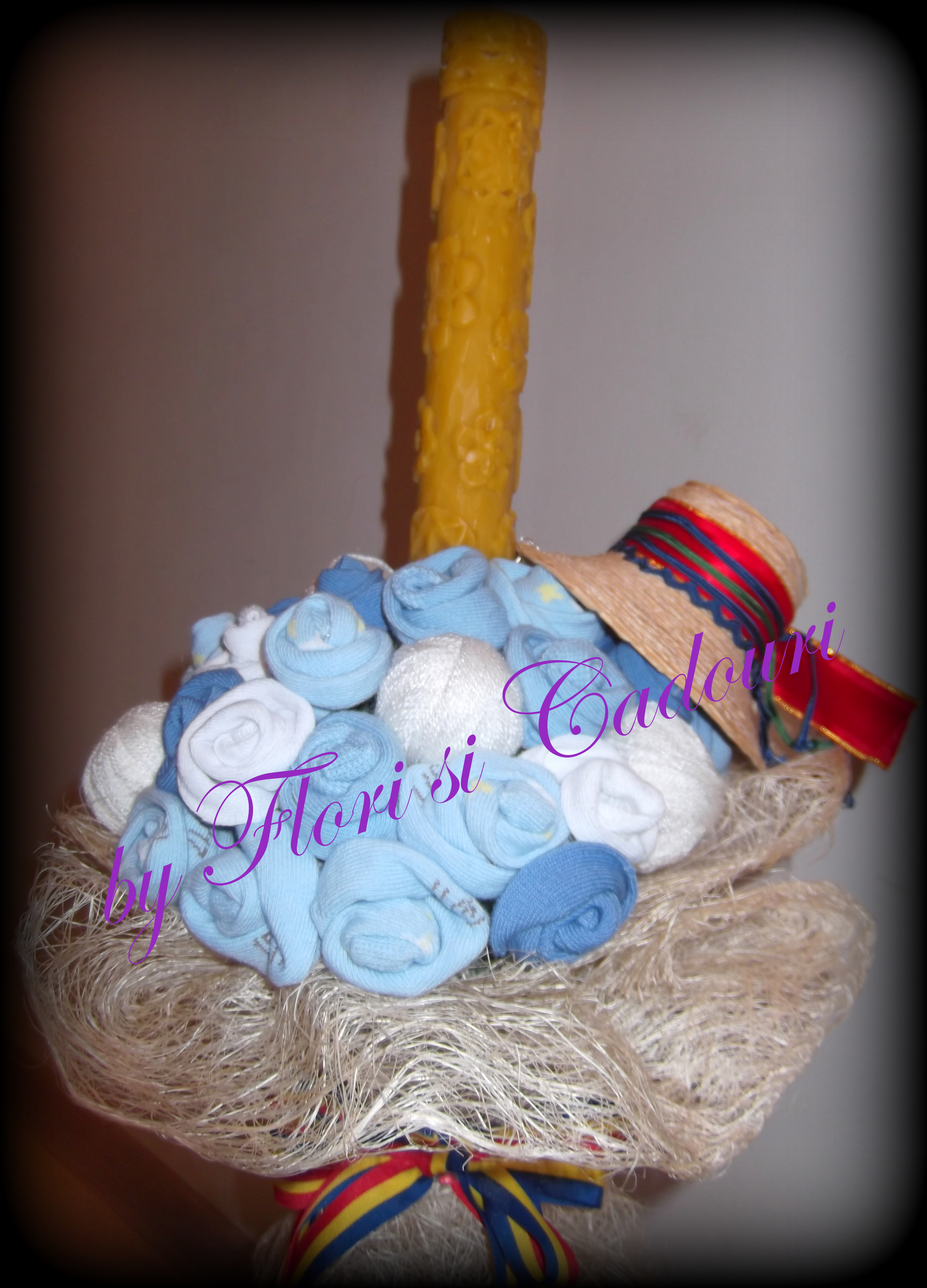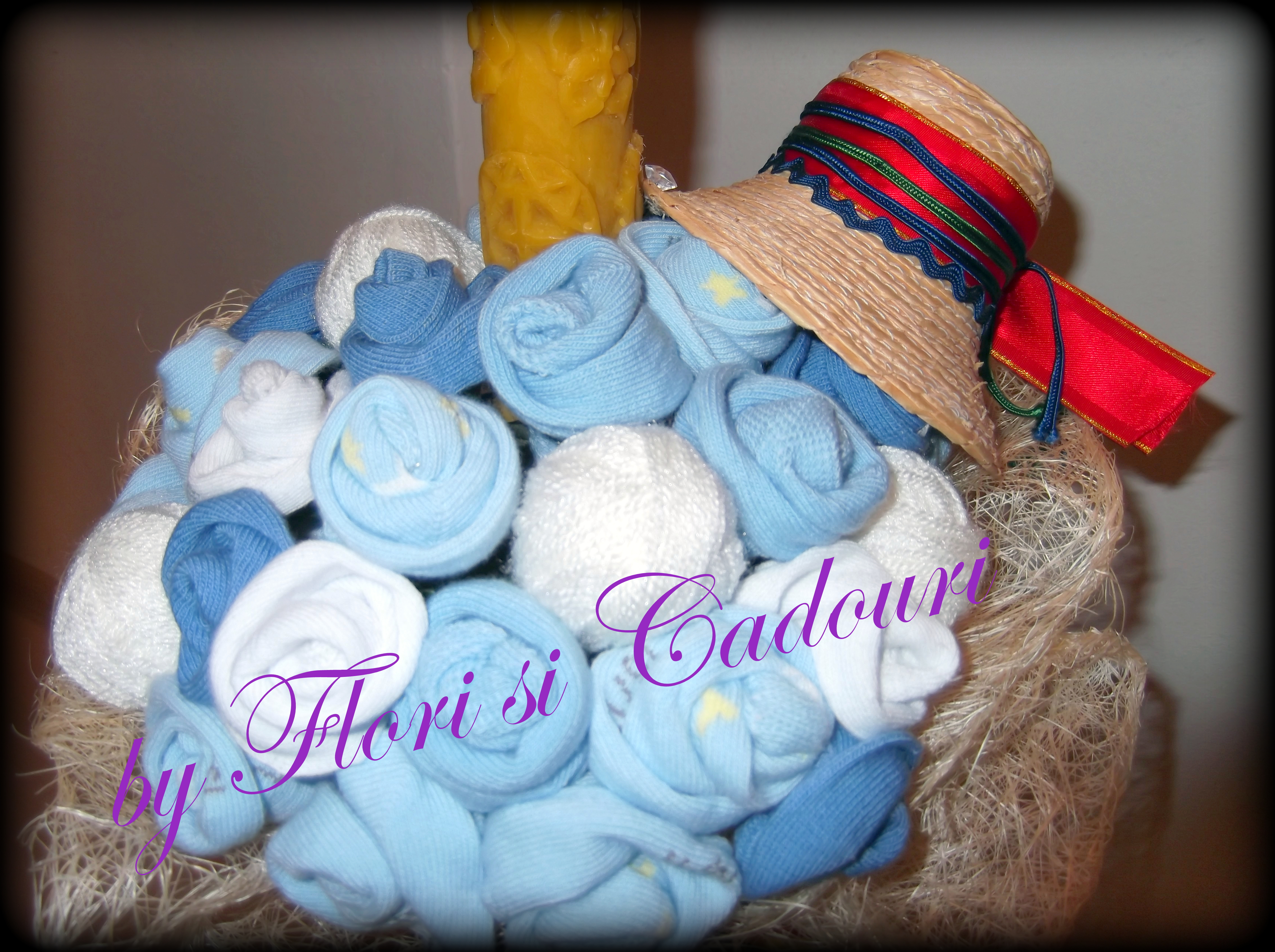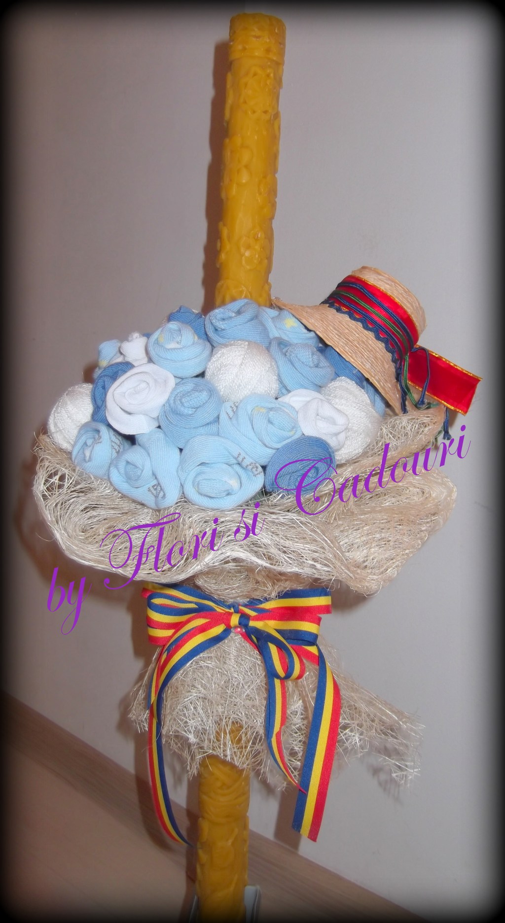 din sosetele de bebe, gheme de lana, ornata cu un clop si tricolor.
