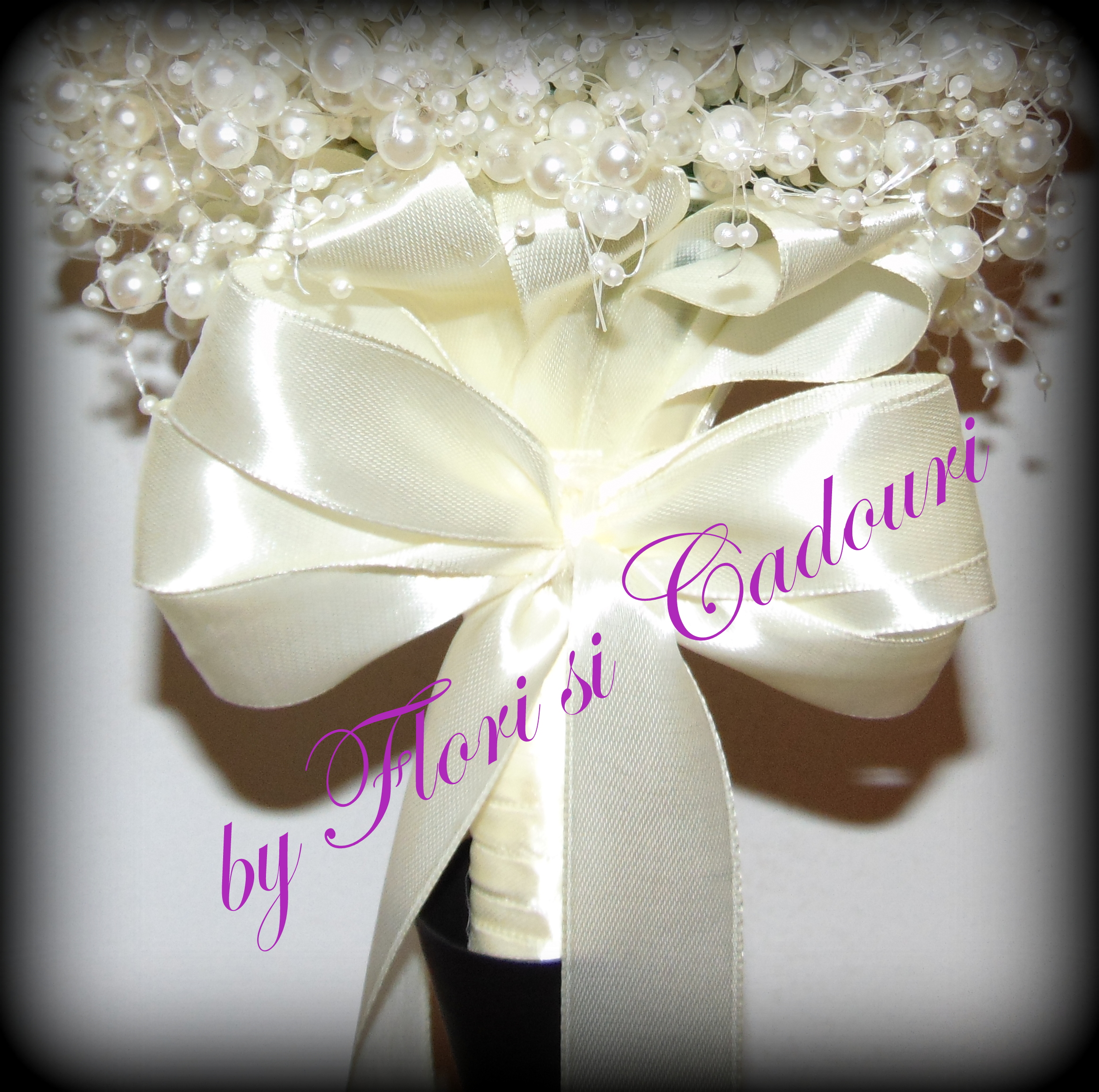 Buchetelul este lucrat din perle si satin si poate fi personalizat schimband  culoarea panglicii, pentru a se potrivi cat mai bine cu rochita sau colorile nuntii voastre.