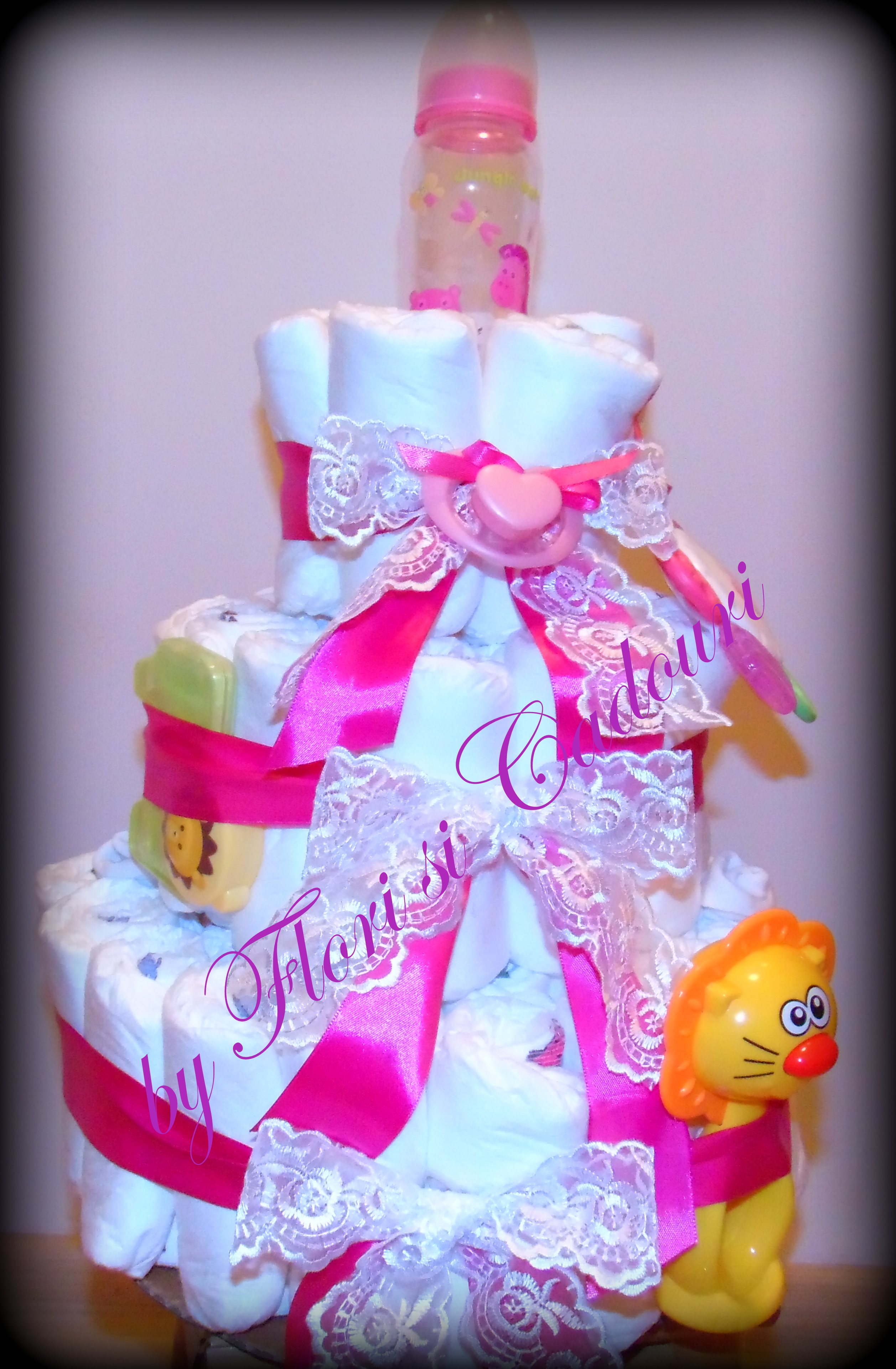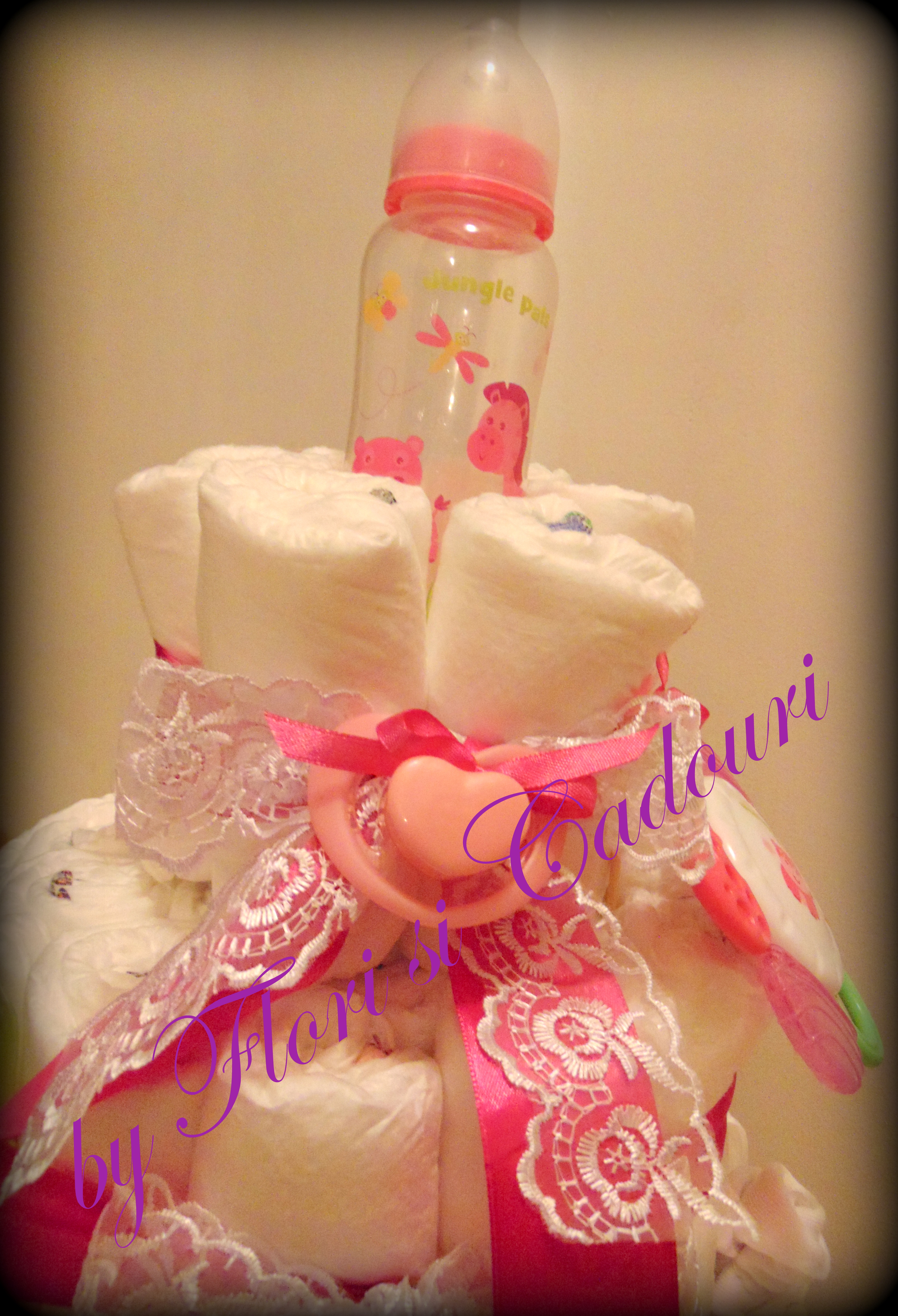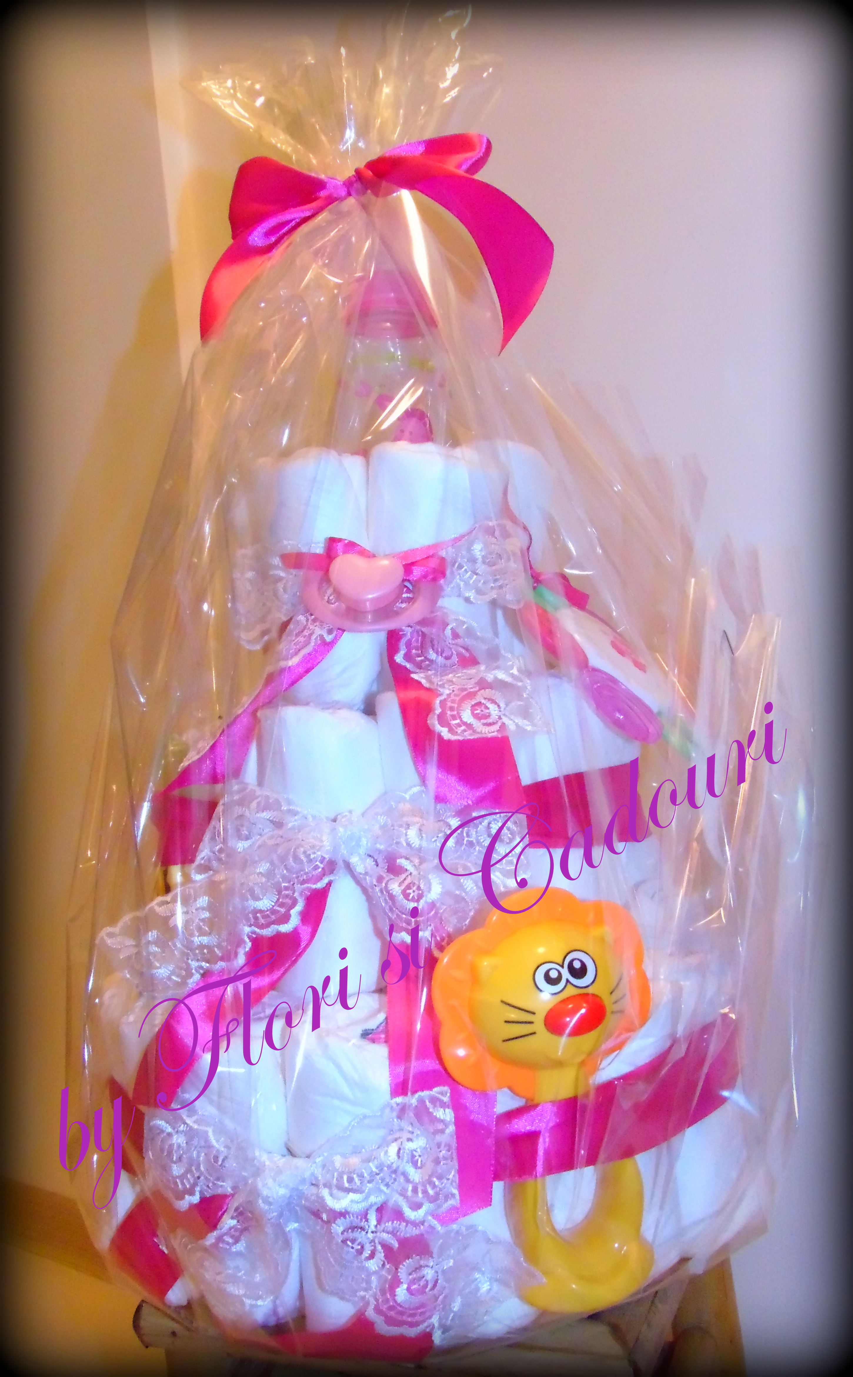 Tortul contine pampersi, sosetele, un biberon, o suzeta