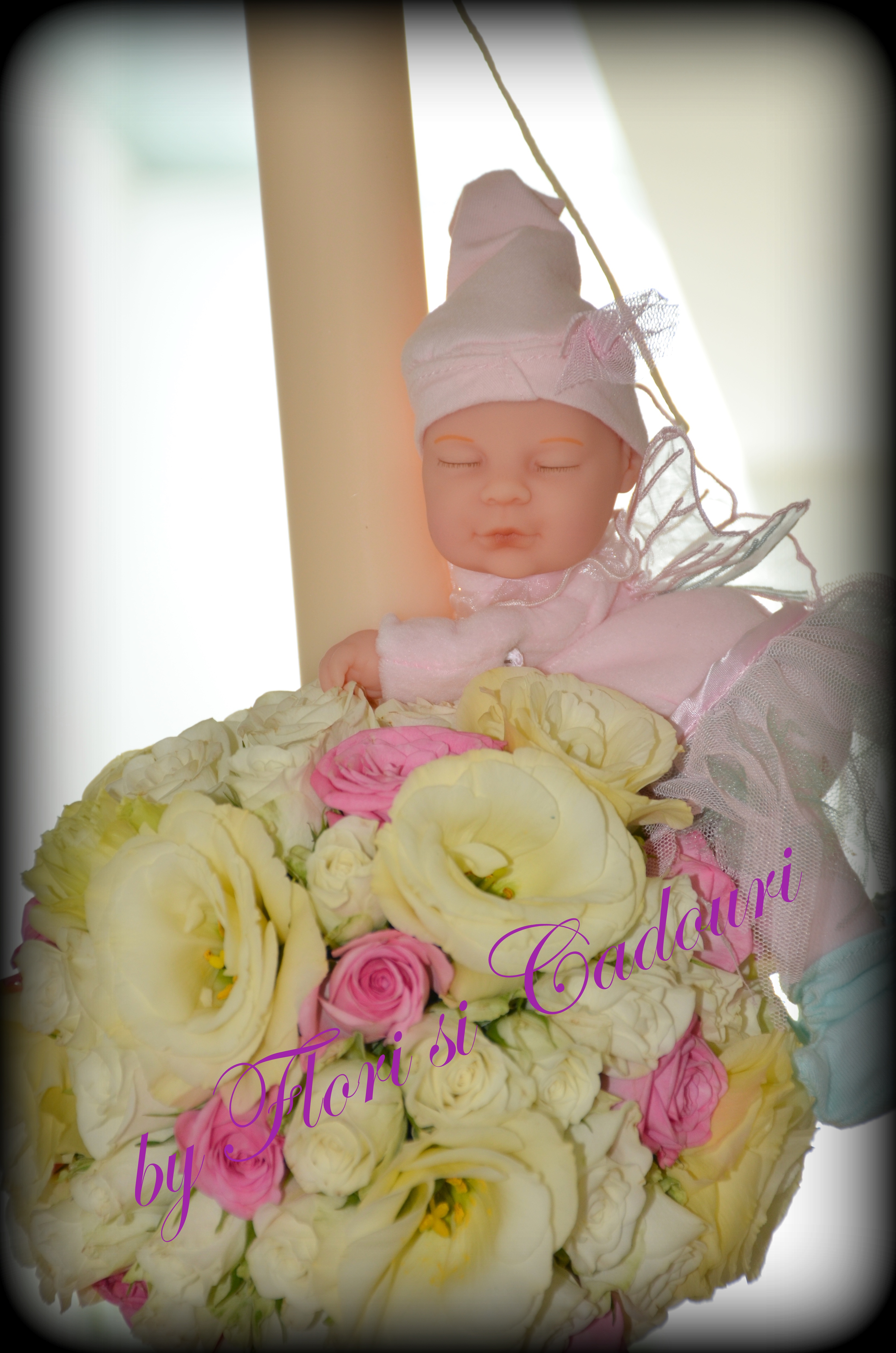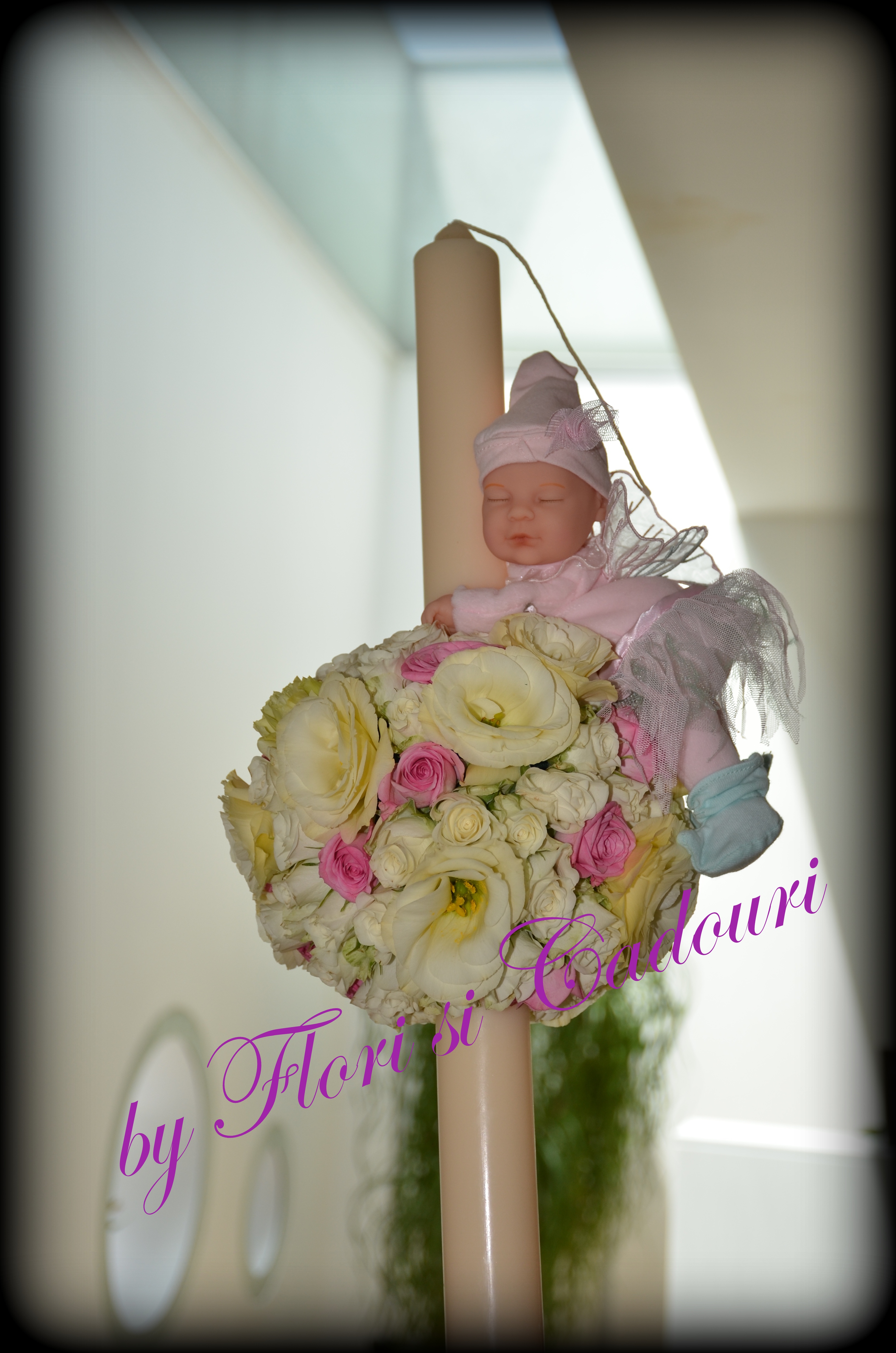 Lumanare Botez cu aranjament din miniroze si lisianthus crem