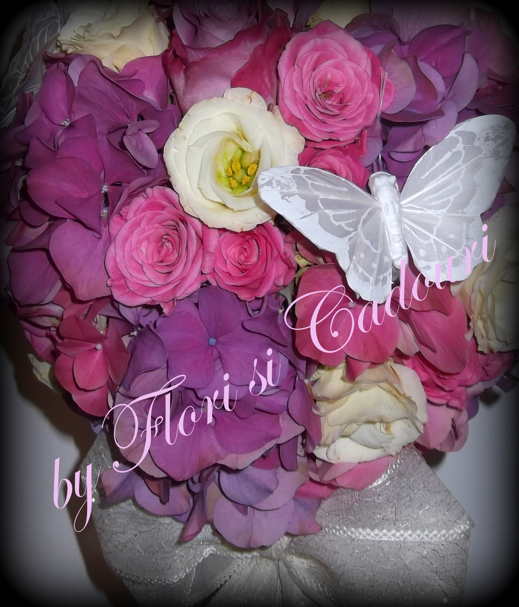 din trandafiri, miniroze, hortensie si lisianthus,