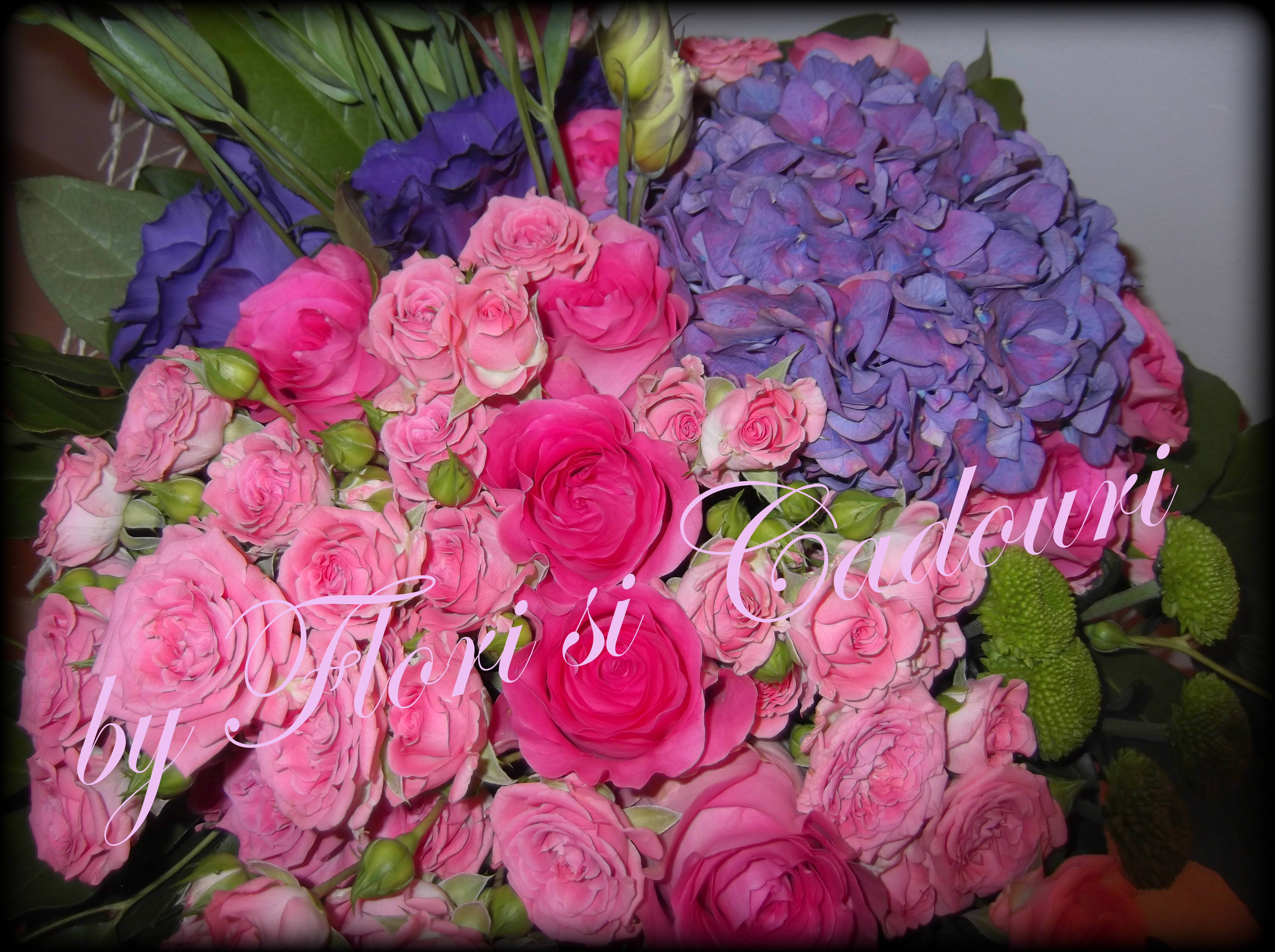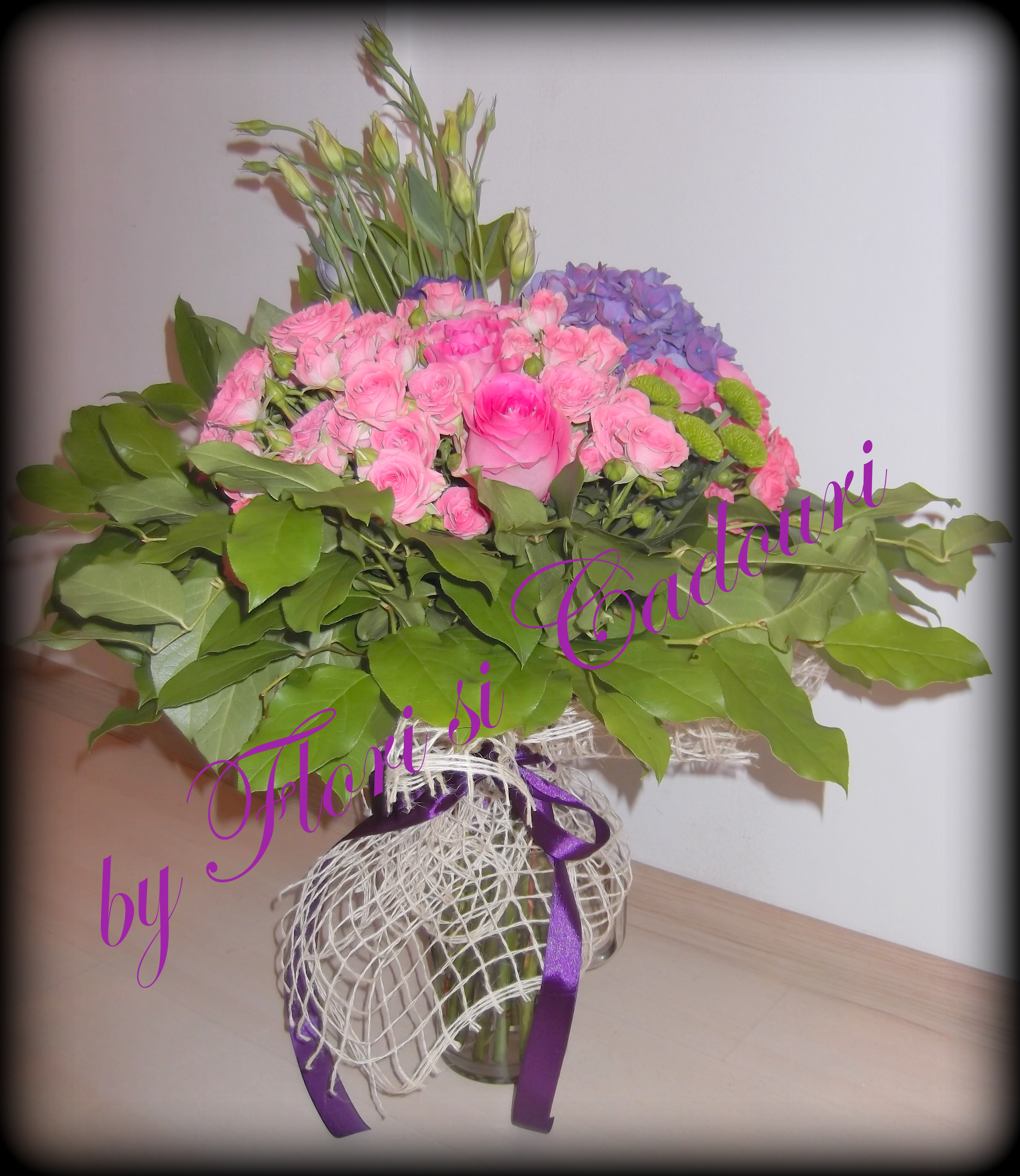 Buchet trandafiri, miniroze,lisianthus, hortensii si santini,