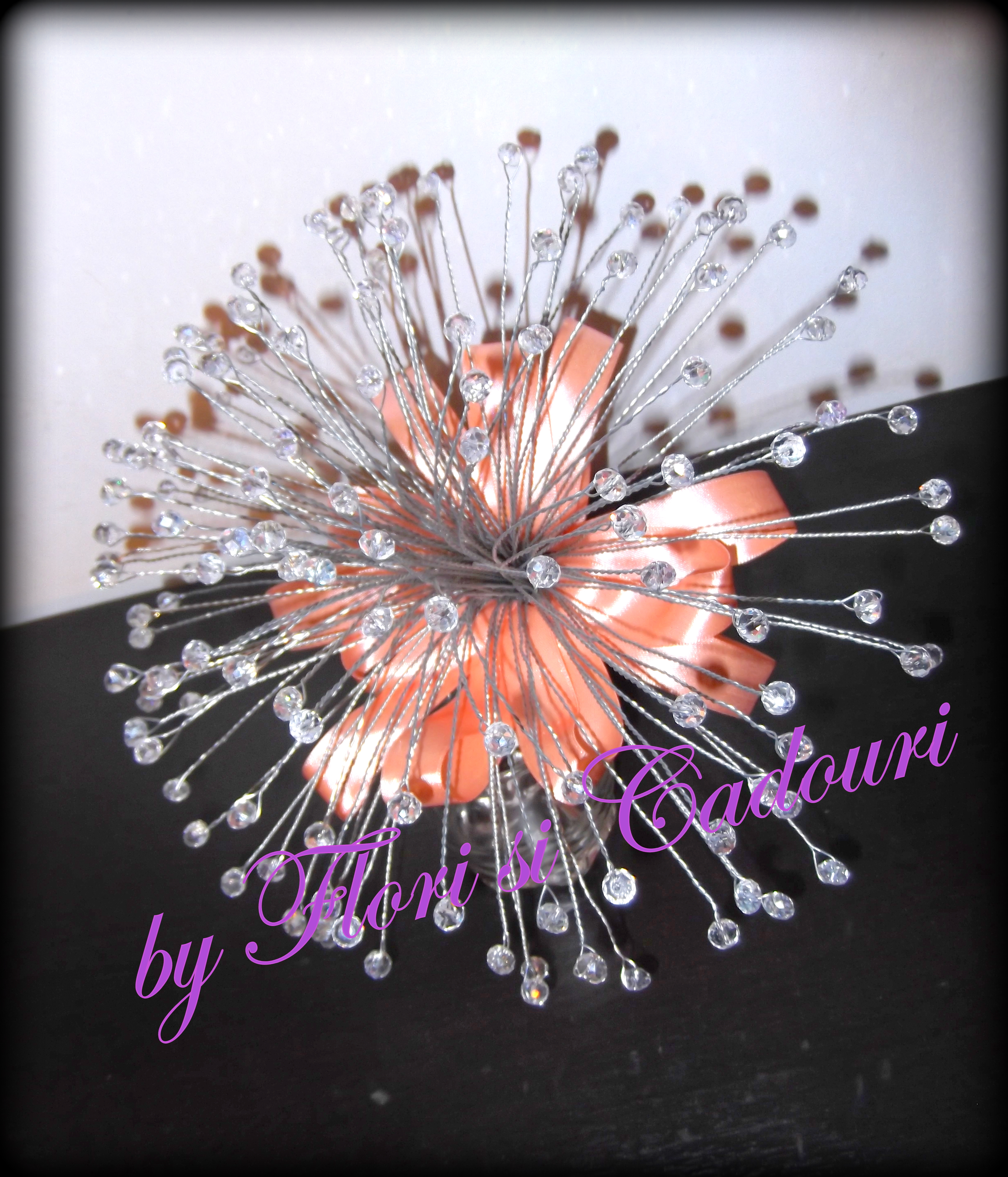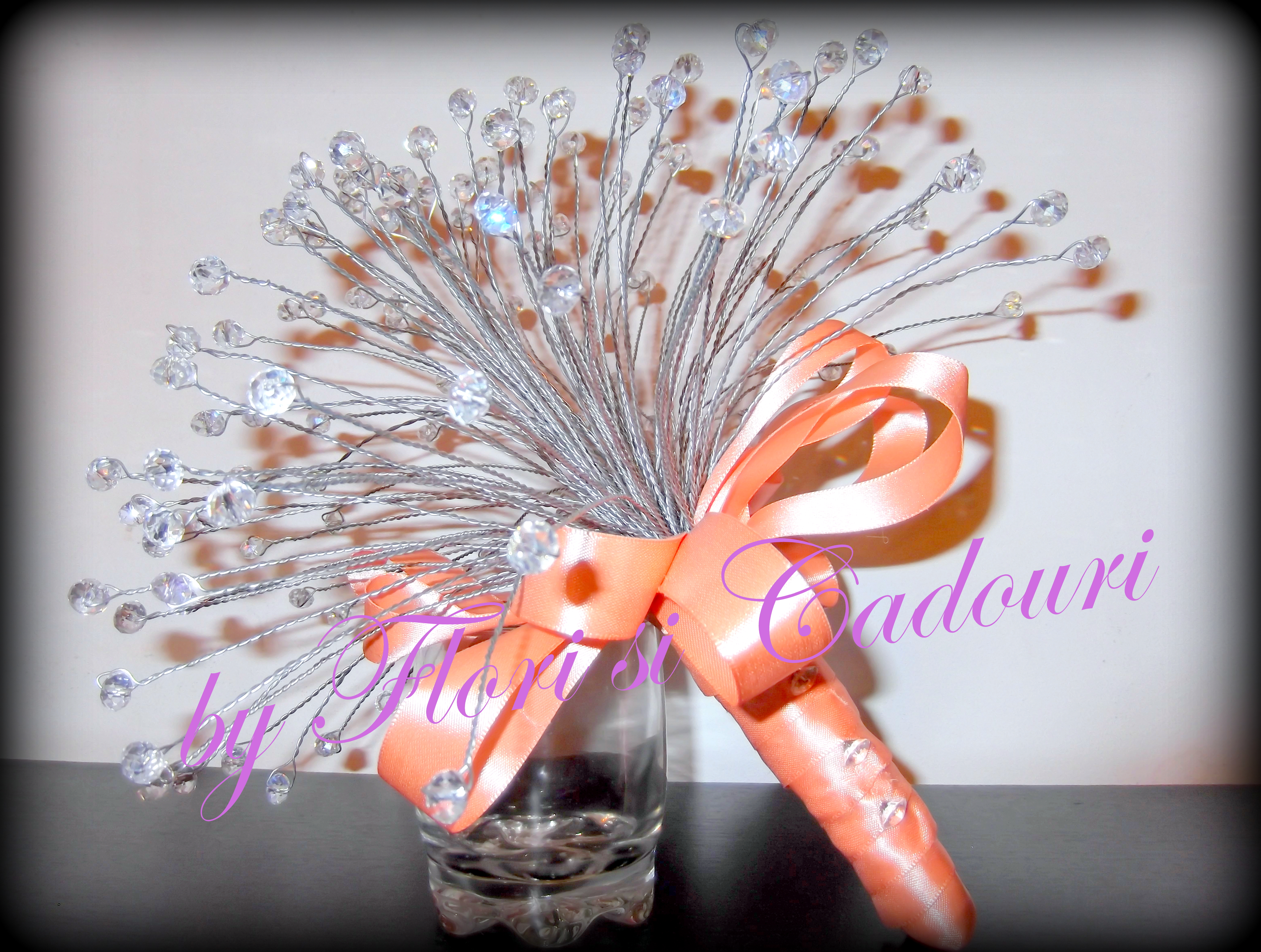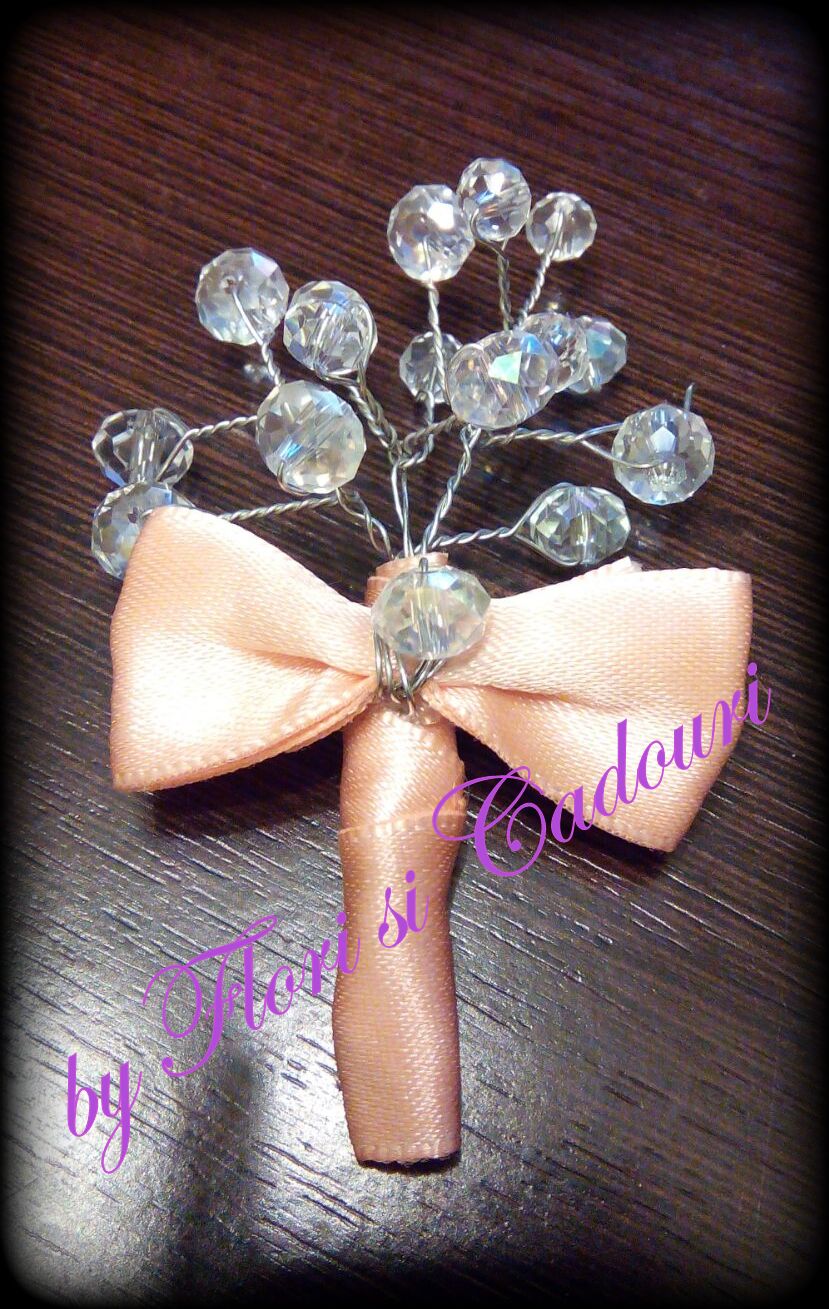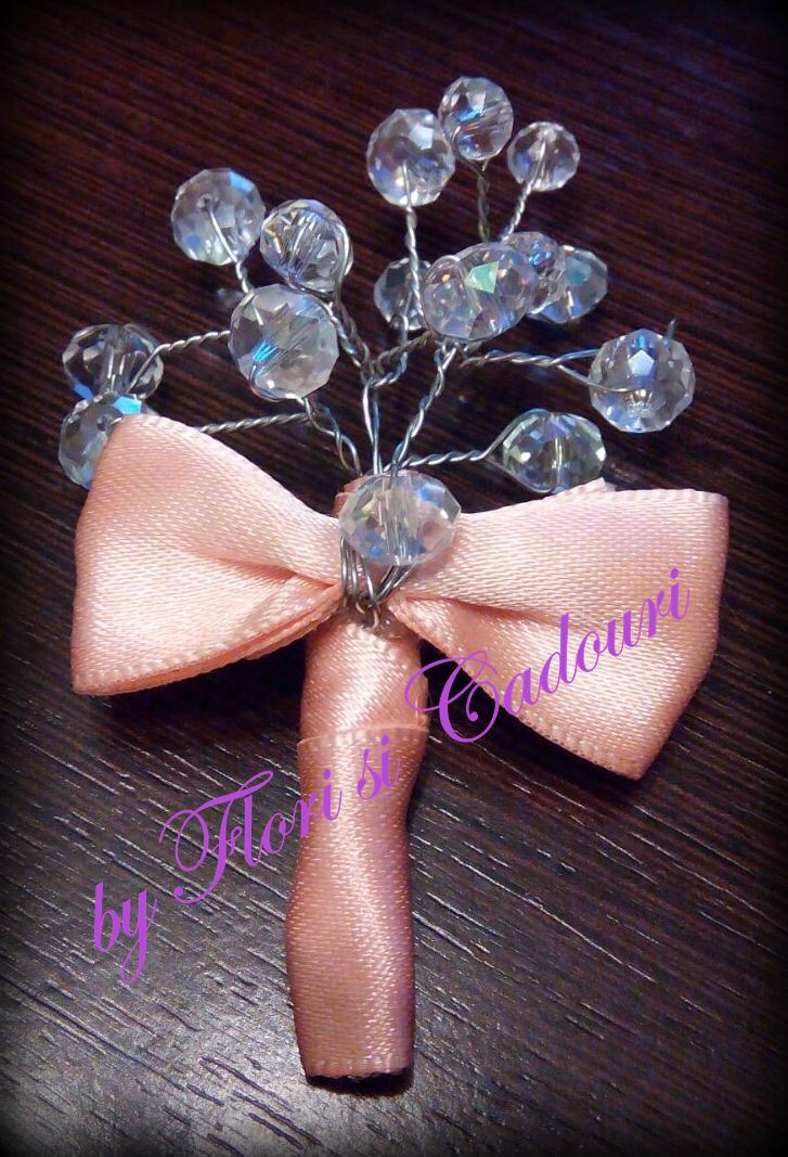 Buchet si cocarda din cristale transparente, cu funda de satin.
