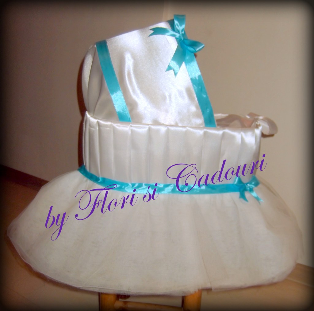 Caruciorul este lucrat manual si se poate personaliza schimband culorile satinului si a fundei.