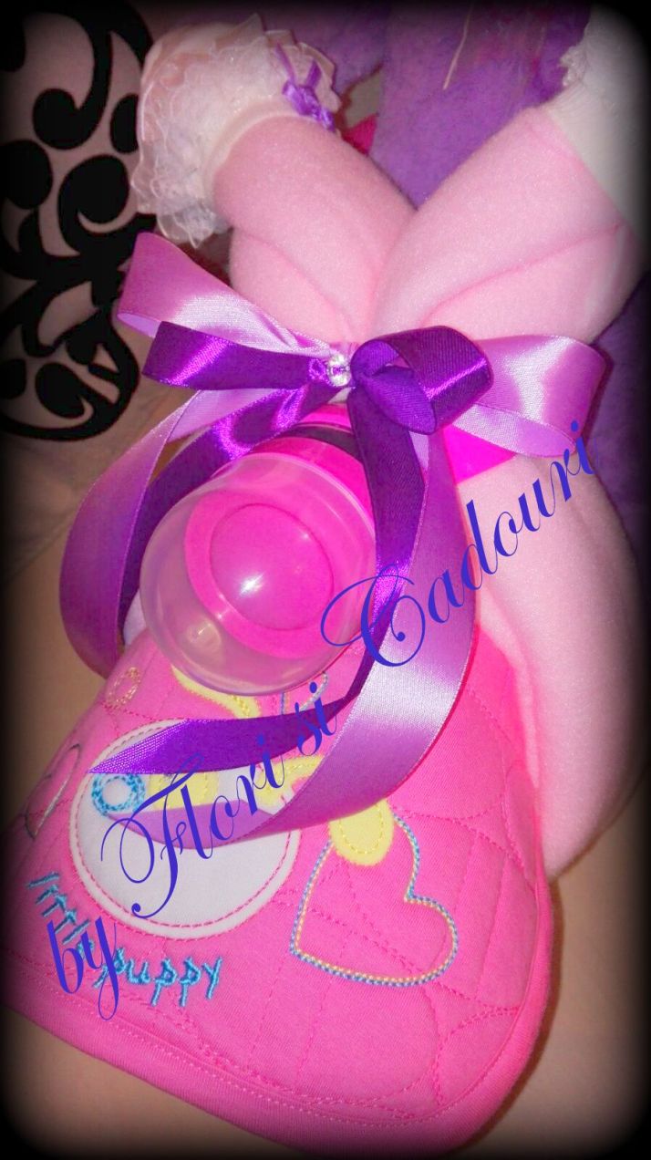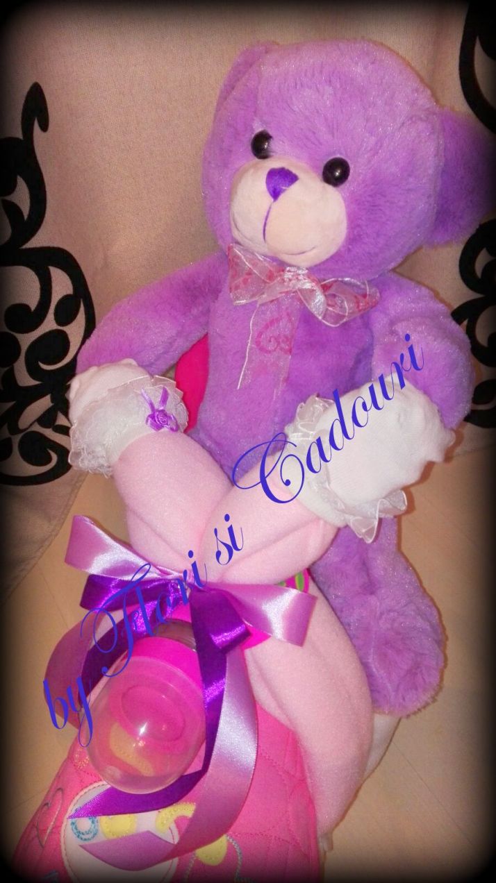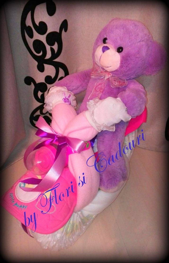 Ideal pentru botez sau pentru aniversarea bebelusului, contine obiecte ce pot fi folosite – scutece, paturici, bavetele, sosetele, un biberon si o jucarie de plus.