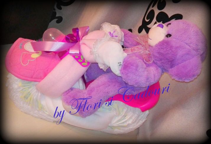 Motocicleta din pampersi cu ursulet