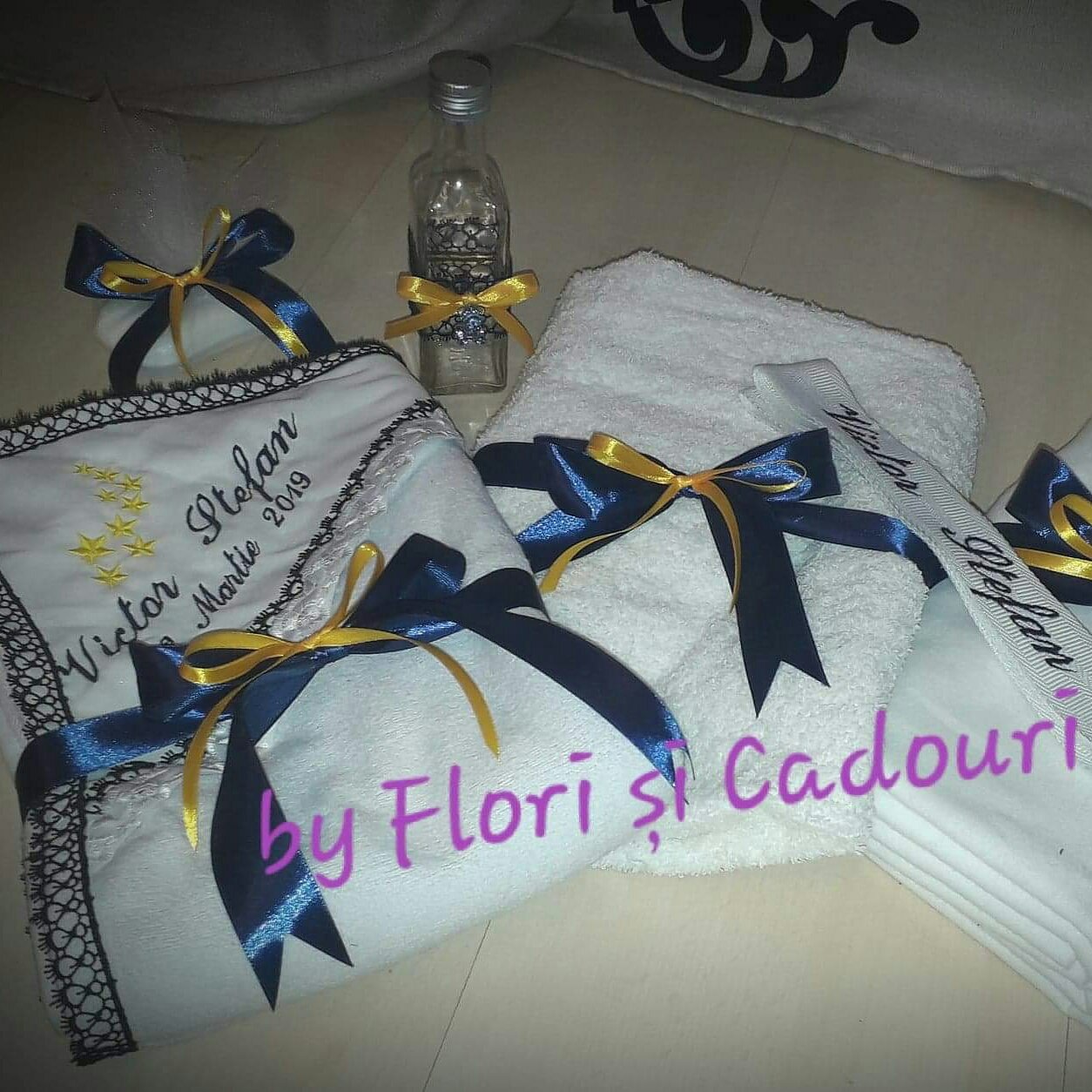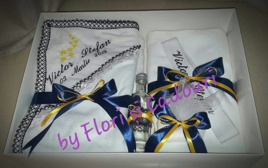 Trusou de Botez compus din prosop pentru bebe, personalizat cu numele si data, panza de mir, prosop pentru preot, fasa, personalizata, sticluță pentru mir si sapun.