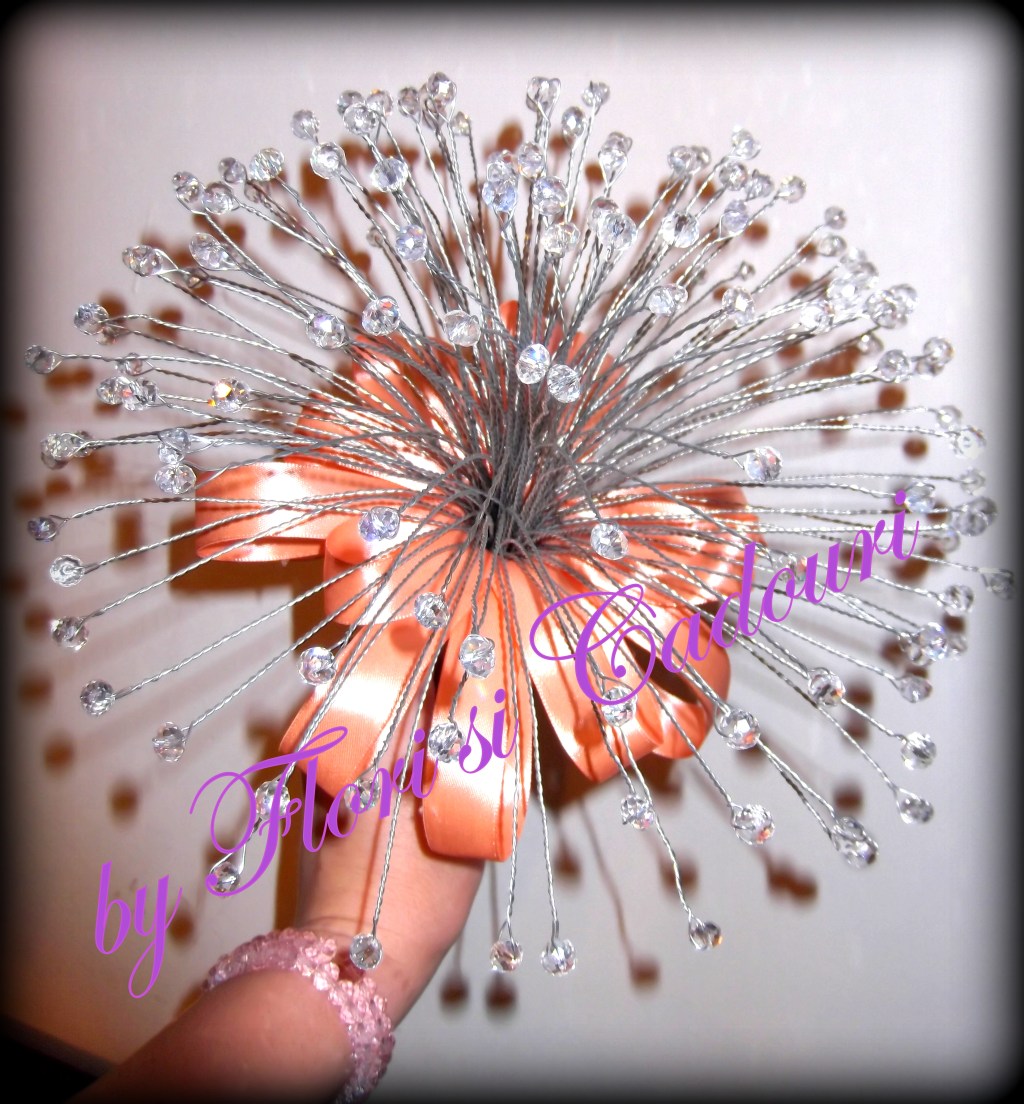 Buchet si cocarda din cristale transparente, cu funda de satin.