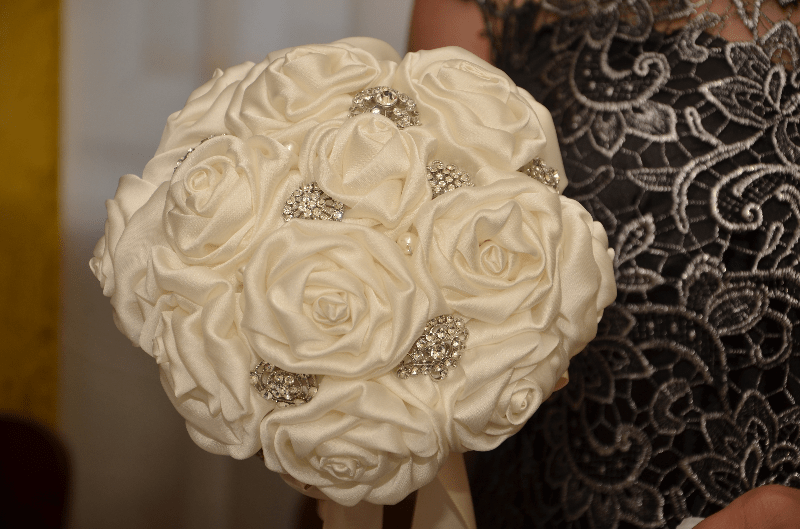 Un buchet elegant, inspirat de articolul nostru Buchete Altfel. Florile sunt lucrate manual, din organza ivoire. Buchetul este innobilat cu brose delicate si perle. Cocardele sunt completarea perfecta tinutei elegante a mirelui.