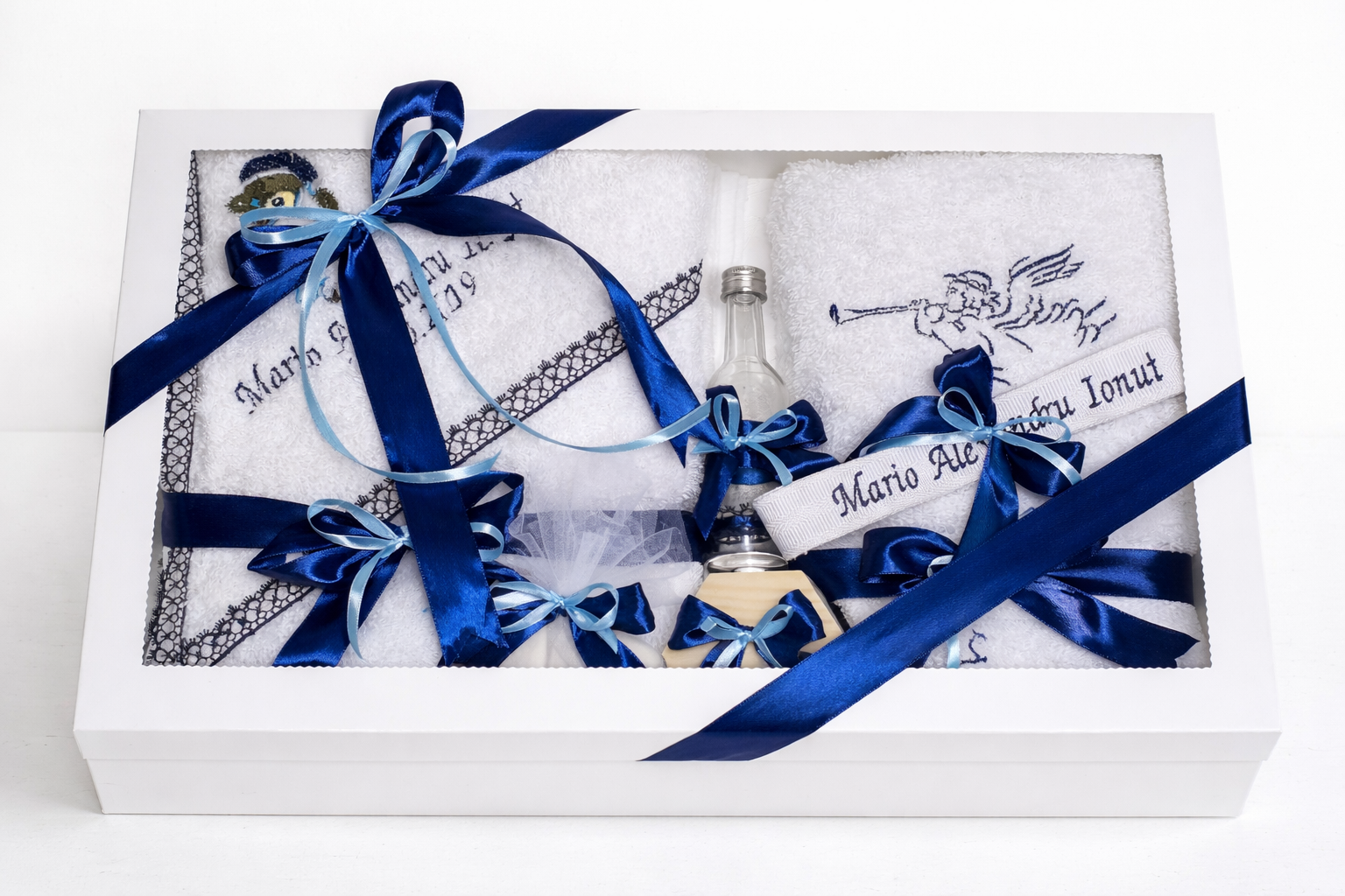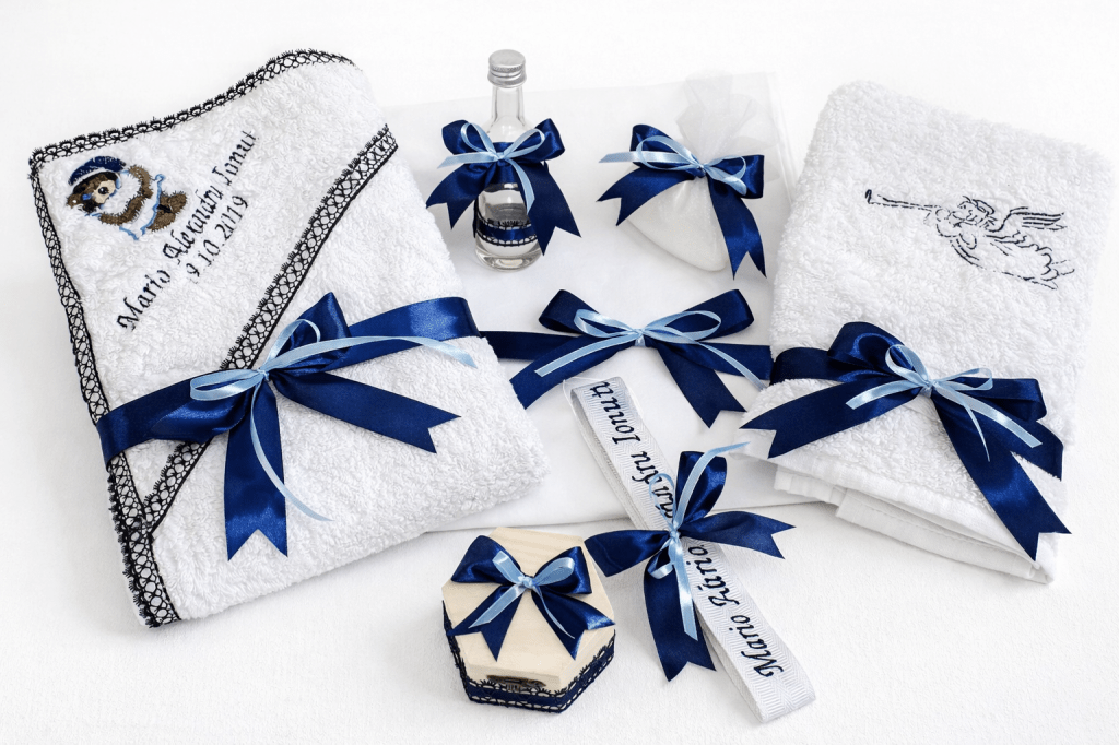 Detaliile brodate și fundele atent lucrate transformă acest set într-o alegere deosebită pentru un eveniment plin de emoție. Personalizarea cu nume și dată adaugă un plus de unicitate, făcând din acest trusou o amintire prețioasă pentru întreaga familie.