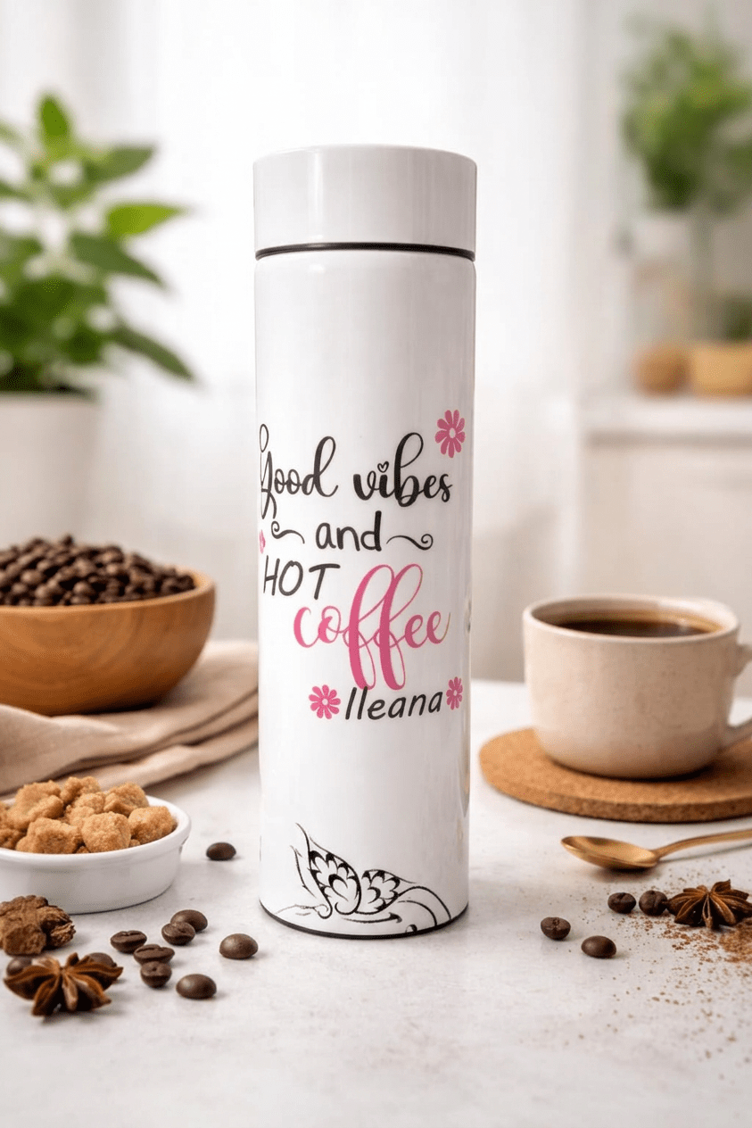 Alege un termos personalizat care îmbină perfect utilitatea cu stilul. Cu o capacitate de 500 ml, este ideal pentru cafeaua de dimineață, ceai sau băuturi reci, oriunde te-ai afla.